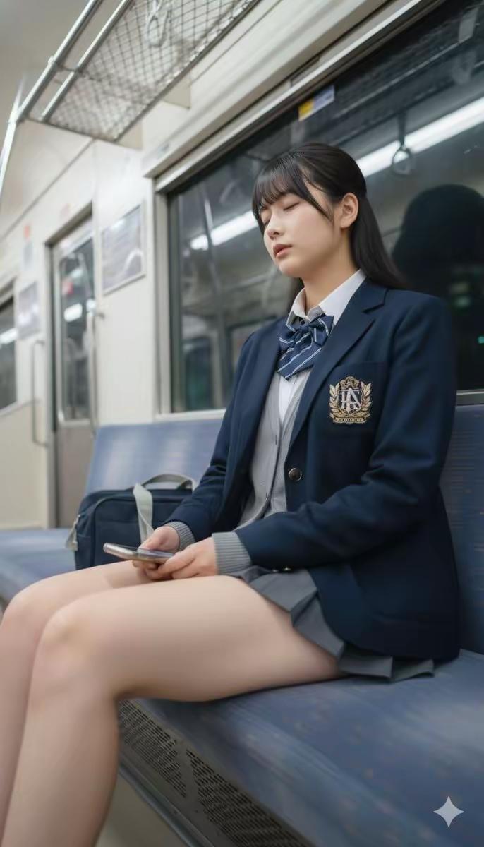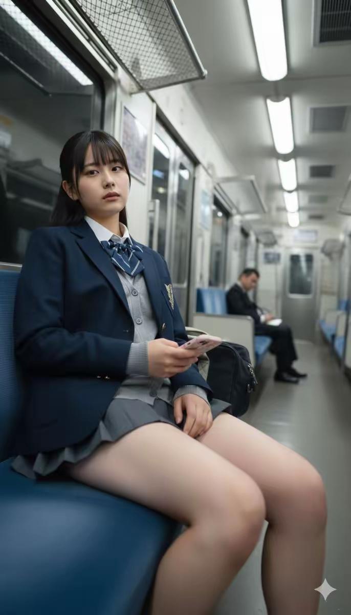 青春校园风,少女在地铁上低头玩手机,时尚穿搭引人注目。