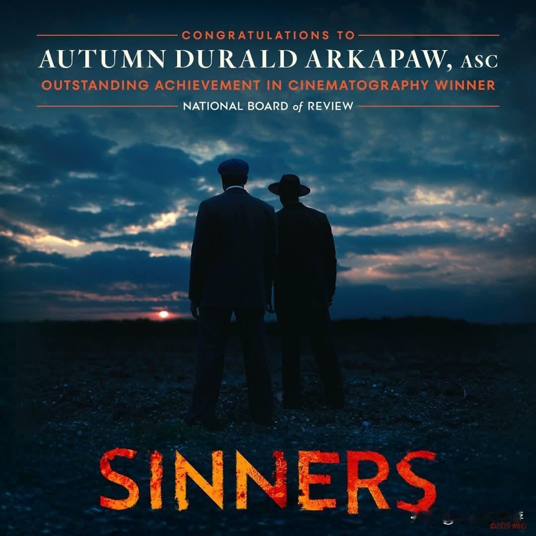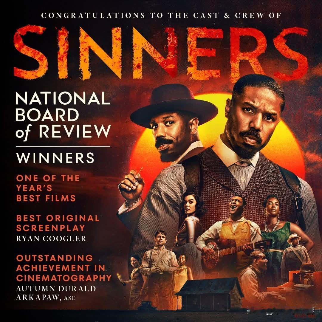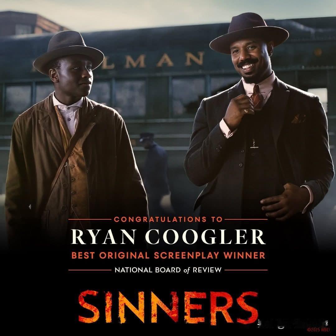 美国国家评论协会将《罪人》列为 2025 年最佳影片之一,瑞安·库格勒获得最佳原创剧本奖,欧特姆·杜拉尔·阿尔卡帕获得杰出摄影成就奖。