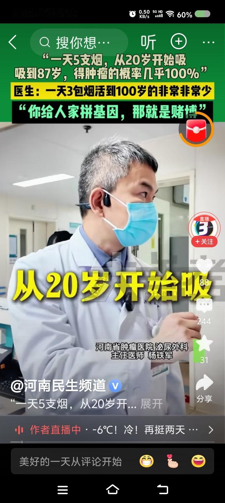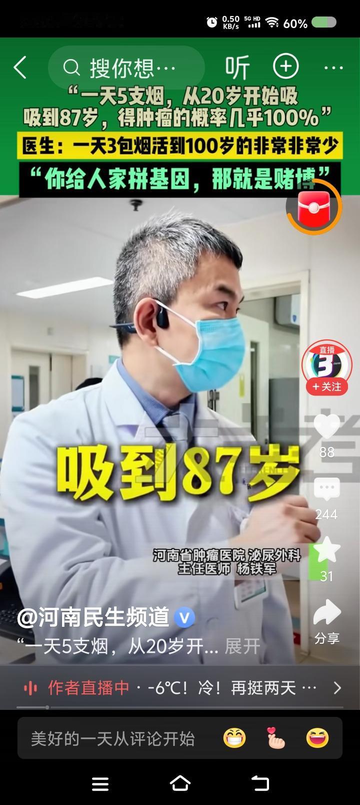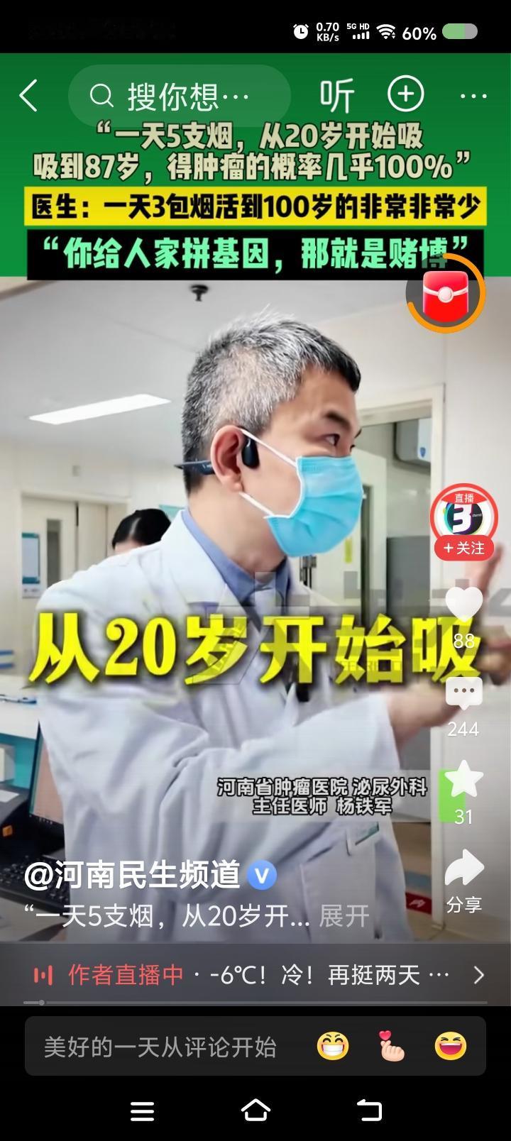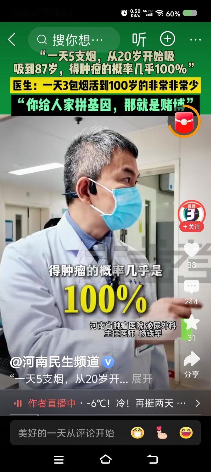 网上最不缺的是杠精!—— 据报道,一个医生在讲吸烟的危害,一天5根烟,八十几岁得肿瘤机率近乎100%,…… 评论区有人说,我奶奶80多了,抽烟很厉害,很健康。有人说,有个邻居,二十几岁,不抽烟,死了,肺癌。 点评: 中国网络,杠精最多。动不动“我爷爷我奶奶……” 杠精最喜欢三件事:一、不讲理论和逻辑,光举例子。二、喜欢横向比较。生命是互相比吗?不是自身和自身比吗?这个常识不知道吗?三、特别喜欢特例。一个寿星又抽烟又喝酒又打牌又喜欢美女,杠精们乐疯了:“天赐英雄!所以,吃喝玩乐好色,非常好!” 这是一群什么物种? 吸烟的危害,还用说吗? 医生说,酒类,作为饮品,也是有害的,“适当饮用有好处”,没有科学根据。