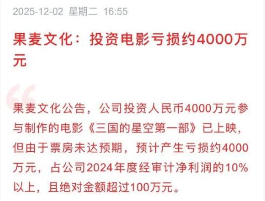 看到上市公司果麦文化公告,投资易中天的电影《三国的星空第一部》亏损约4000万元,不知道后面还有没有投资第二部、第三部,如果有的话,那真的要亏惨了。 我给果麦文化的一个好点子,易中天现在和董宇辉的关系也不错,易中天的电影宣传还专门去了董宇辉的直播间,果麦文化是不是考虑一下收购董宇辉的“与辉同行”公司,通过增发股份的方式并购董宇辉的公司,把董宇辉这个超级头部网红主播纳入旗下,那果麦文化投资电影亏的那几千万就马上变成小钱了。 要知道董宇辉公司旗下的账号,2025年的直播带货销售额应该应该可以达到150亿元,公司的净利润10亿元应该是轻松实现的,如果果麦文化能够把董宇辉收入囊中,增发股份让董宇辉成为公司大股东,那未来果麦文化的发展空间就非常大了。