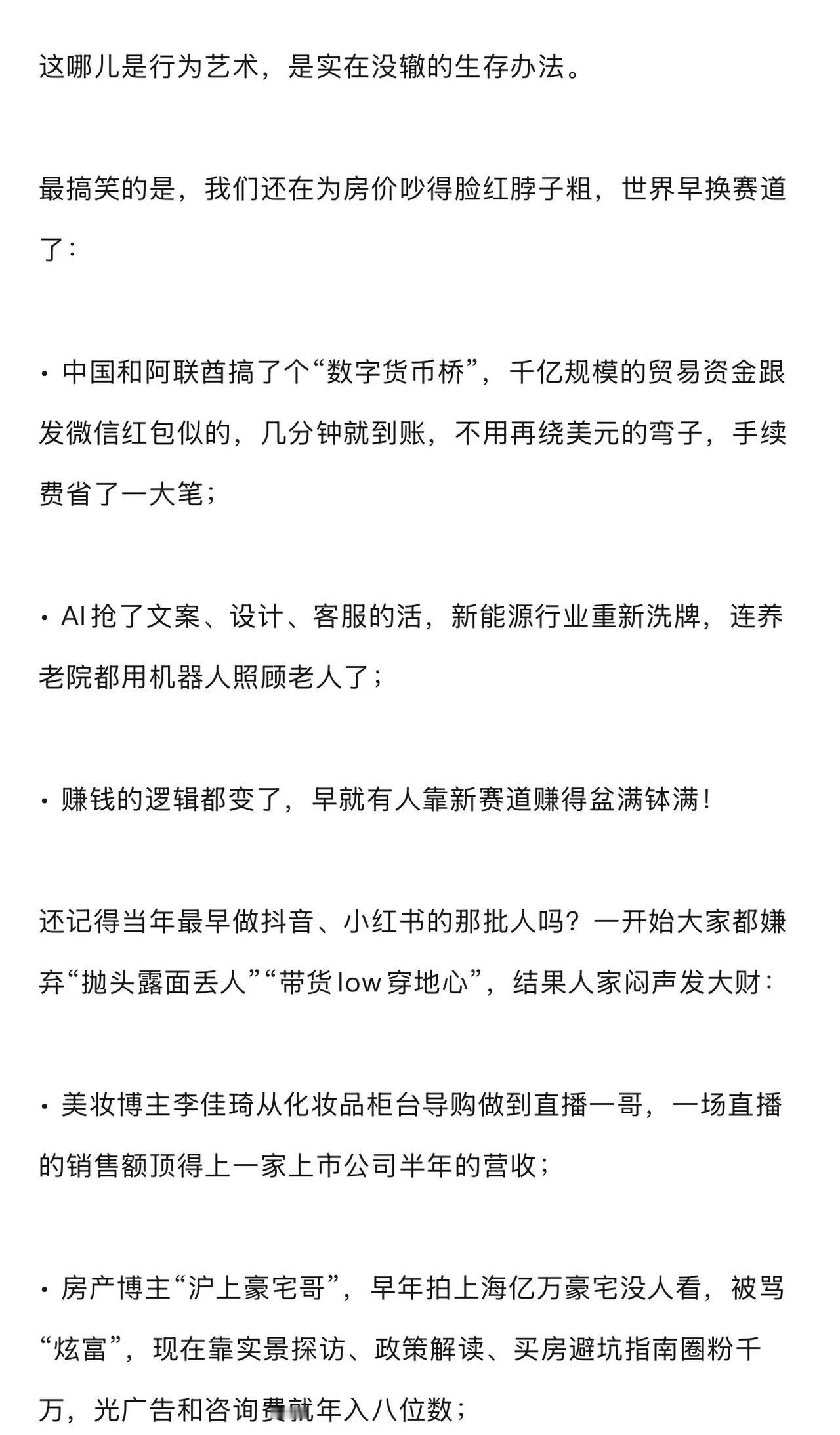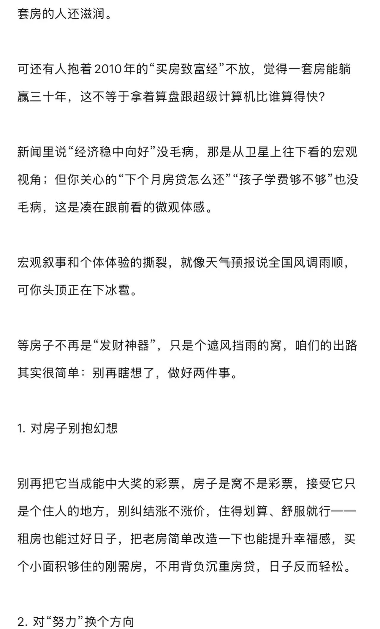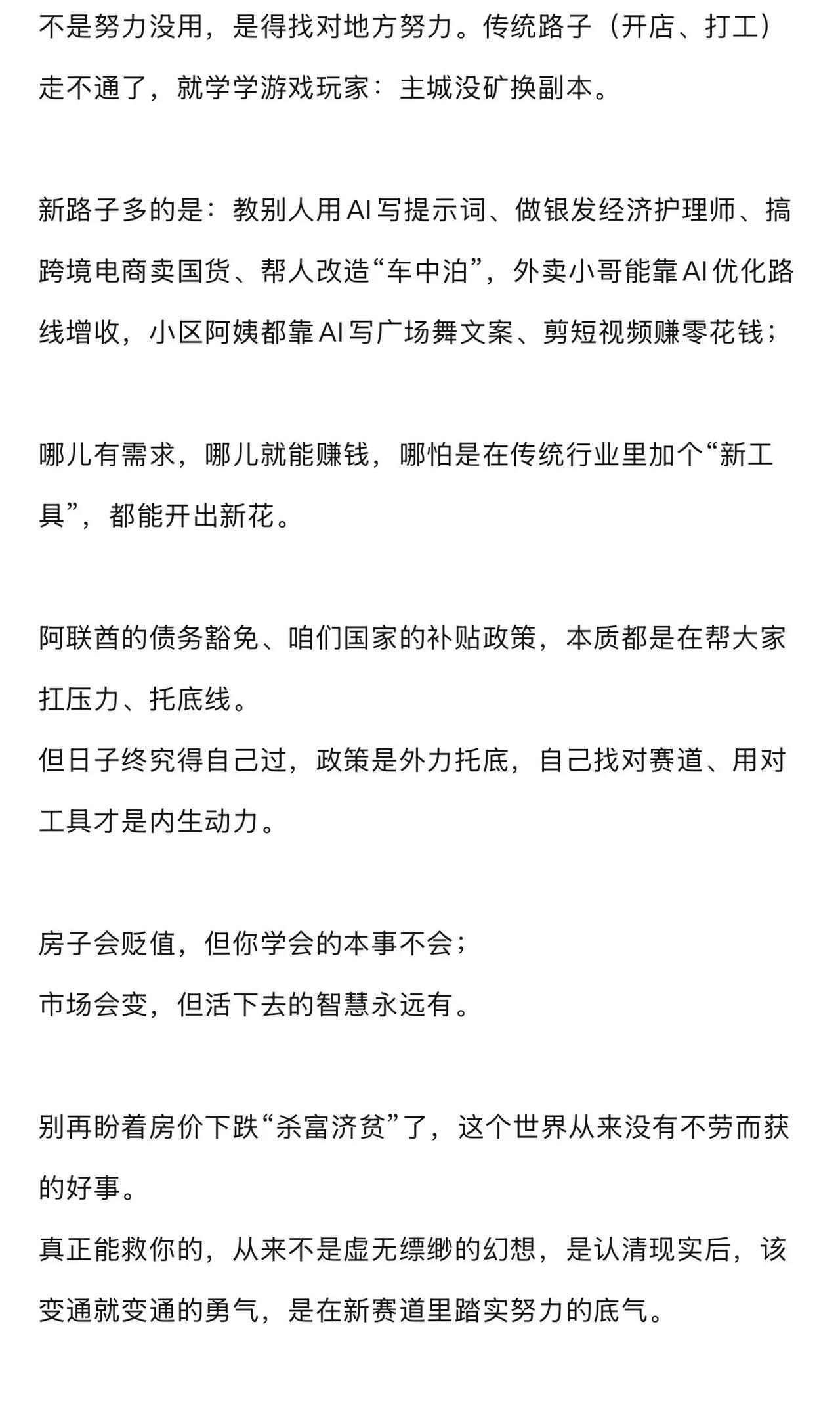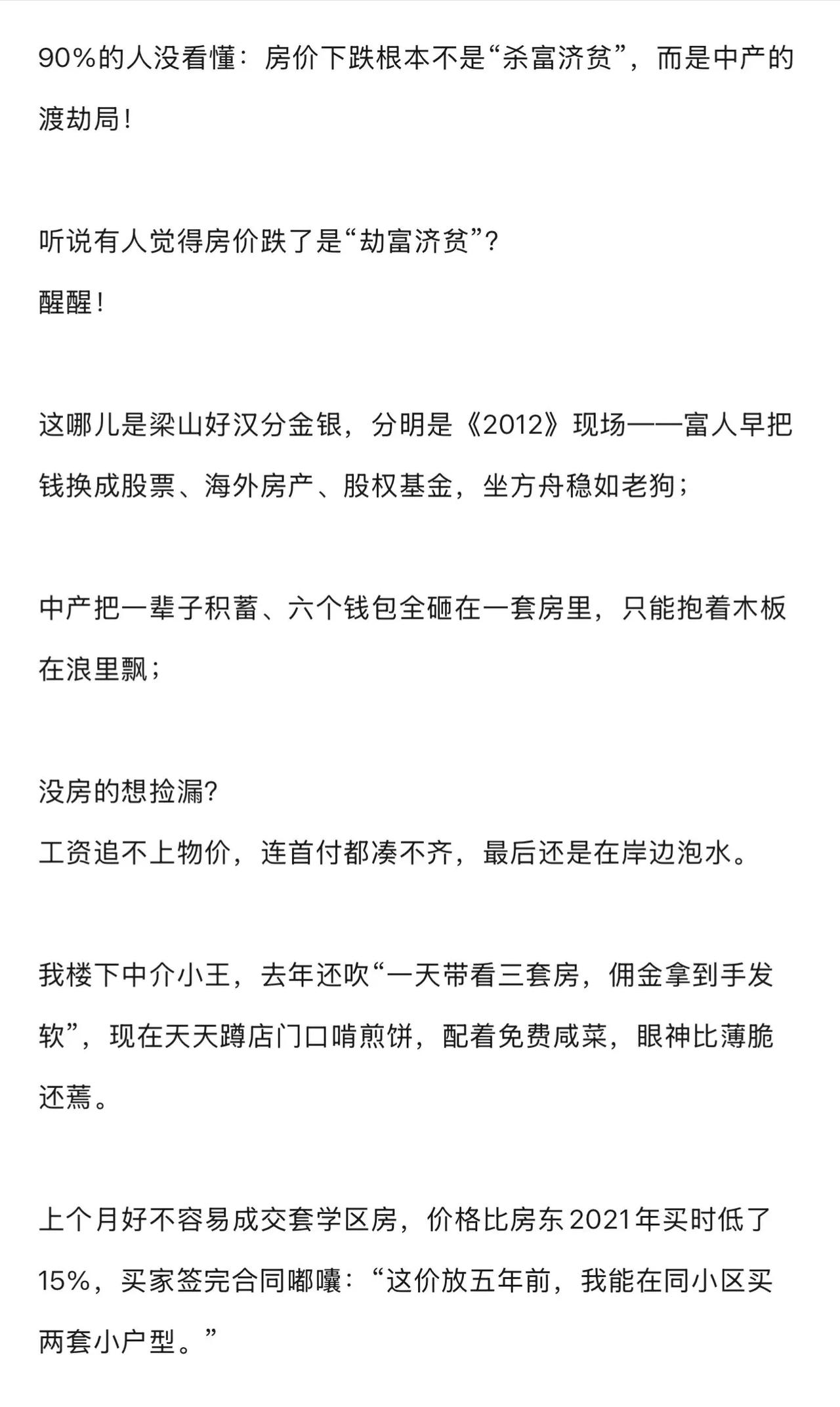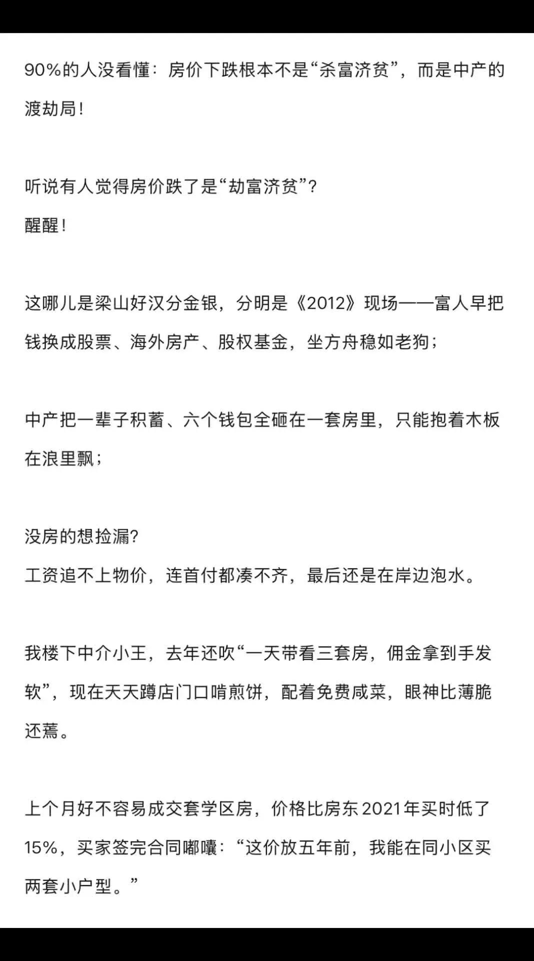 听说有人觉得房价跌了是“劫富济贫”?醒醒!这哪儿是梁山好汉分金银,分明是《2012》现场——富人早把钱换成股票、海外房产、股权基金,坐方舟稳如老狗;中产把一辈子积蓄、六个钱包全砸在一套房里,只能抱着木板在浪里飘;没房的想捡漏?工资追不上物价,连首付都凑不齐,最后还是在岸边泡水。房价真相 生存经济学 楼市变局 政策补贴红利