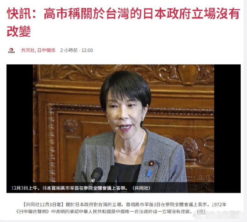 高市终于嘴不硬了,但还是玩着她老一套的文字游戏,说话就只说了我们想听的一半! 就在昨天,也就是12月3日,高市在日本参议院全体会议上表示,关于台湾问题,是基于1972年的《日中联合声明》的,我们的立场丝毫没有改变。 高市说话,从来都不是正大光明的说话,把立场问题像个复读机一样一直再说,但所谓的立场内容,根本不说透,持续的在玩文字游戏,试图混淆是非,把舆论压力转嫁出去。 但对于我们,我们不是想听这些话,而是必须让她把以前的言论收回去。
