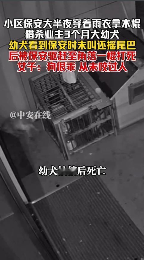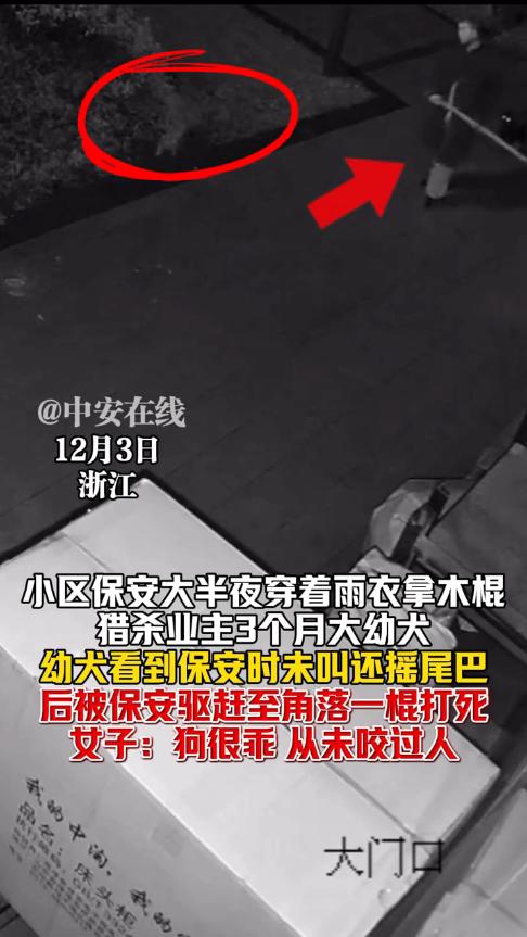“必须严惩!”12月3日,浙江杭州,一小区保安晚上巡逻时,抄起木棍将女子3个月大的小狗逼到墙角,随后一棍子将狗打死!女子表示自己和保安无冤无仇,小狗也没有咬过人,而且养在私人领域。网友:这种保安必须开除! 保安作为小区的工作人员,肩负着保护业主财产的重要职责,可是有的保安却人面兽心,内心不知道有多黑暗,居然对没有攻击性的小狗痛下杀手。 当天晚上,该保安在小区里转悠时,特地穿上了雨衣,随后朝着张女士所在的公司走来,走到门口附近时,他发现了那只小狗,于是拿起一旁的木棍,将小狗逼到了墙角处。 小狗并没有反抗,也没有冲着保安吠叫,只是害怕的不敢动弹,可保安却直接对着狗头一棍子下去,小狗瞬间就倒在地上抽搐起来,没多会就死掉了。 第二天早上,保安又回来将小狗的尸体带走,丢进了绿化带中。 张女士来上班后,没有发现狗狗,查阅监控后看到了这恐怖的一幕,她既伤心又生气,当即就报了警,民警将保安带走调查。 物业在得知了这种事后,也表示会将该保安开除。 网友看后表示,这种人估计是心理有问题,小狗明明没有招惹他,却故意过来打狗,而且还痛下杀手,真是太缺德了! 信息来源:《小区保安大半夜穿着雨衣拿木棍,猎杀业主3个月大幼犬,幼犬看到保安时未叫还摇尾巴,后被保安驱赶至角落一棍打死,女子:狗很乖,从未咬过人》中安在线
