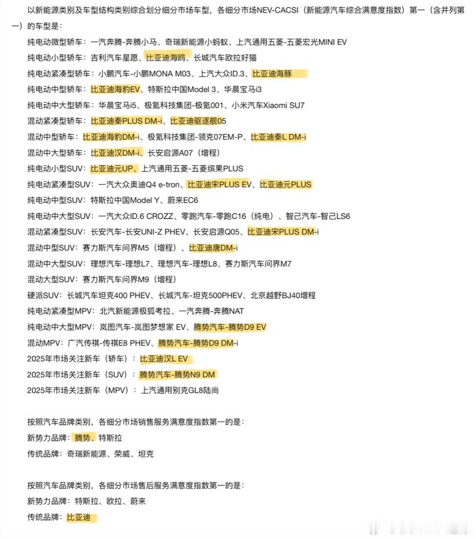 小米的营销真是TOP级的,相比之下比亚迪真是没脸见人昨天大家都看到雷总发的小米SU7用户满意度第一了吧,今天我去官网搜了一下,迪子才是大赢家啊比亚迪总共17款车拿下各细分市场的满意度第一,同时腾势拿下新势力销售服务满意度第一,比亚迪拿下传统品牌售后满意度第一第一名的榜单里可谓哪哪都是比亚迪,不过我看迪子好像没啥反应,可能是没看到吧比亚迪大v聊车新能源汽车