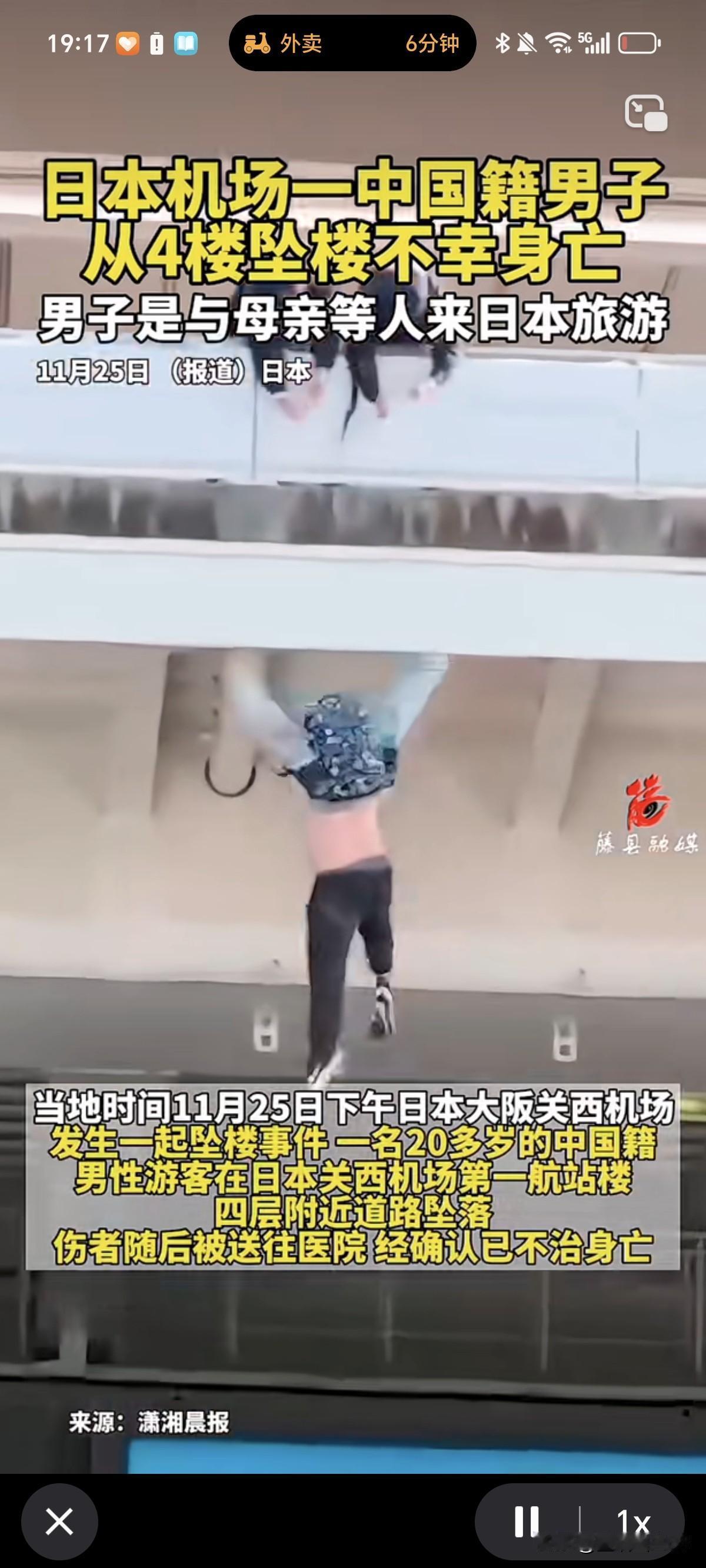真不想看到这样的消息!一名20多岁的中国男子竟然在日本机场四楼坠亡 事发11月25日下午日本大阪关西机场,当警方赶到现场时,一中国20多岁的中国男子正悬挂在道路边缘的护栏外,警察试图将其拉上来时,男子却没有拉住警察的不幸坠落,送医后不治身亡 据说他是和母亲来日本旅游的,不知道是什么原因变成了现在这样 男子和其母亲本来是好好来旅游的,如今怎么会变成这样的惨剧了?事发时他的母亲又在哪里呢?难道其中还有什么隐情吗? 才20多岁就死在了异国他乡实在是太可惜了[祈祷][祈祷]
