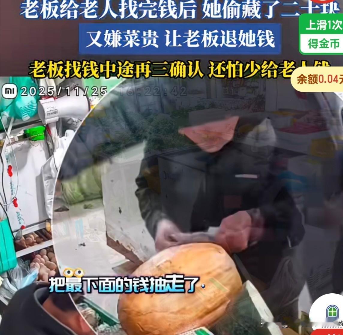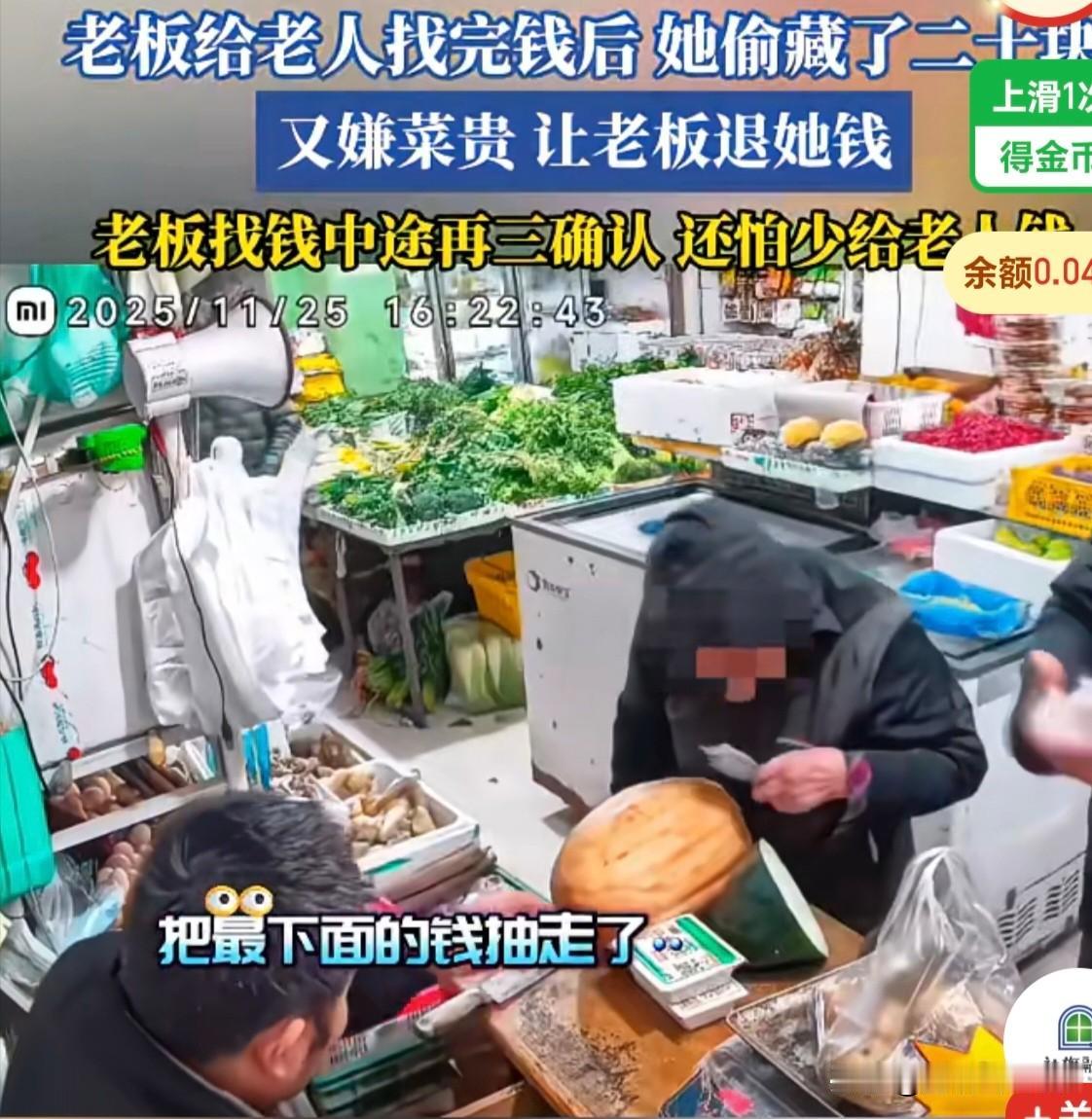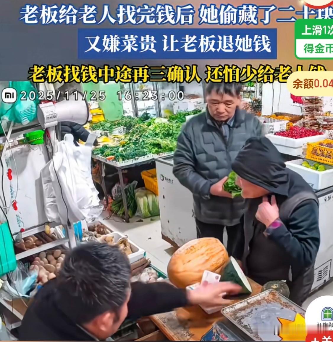 这个老人真的是坏人变老了 他来超市买菜给了老板100元,老板给他找钱,还怕给他找少了再三确认给了他,而老人趁老板不注意,迅速的从钱中拿出二十放到了自己裤兜里,又跟老板推说菜太贵不买了,老板很爽快的把100块又给了老人,收了老人的零钱连数都没数 他或许觉得这么大岁数的老人不会有什么问题吧! 你们说这个老人是不是很过分,看他收钱那么速度他也应该不是第一次干这事 这真的是坏人变老了,原来不是所有的老人都是慈祥善良的…