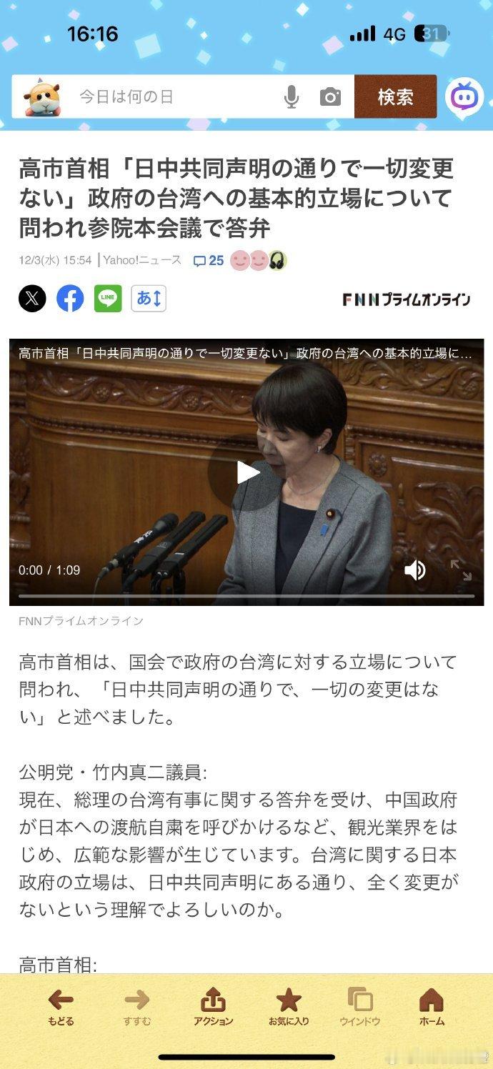 高市早苗终于不嘴硬了高市早苗终于嘴软了,不过依旧还在玩模糊概念那一套。高市早苗称日本的基本立场和1972年的中日联合公报一样,但是不收回之前的言论,玩得还是那套模糊概念,期望以这样的表态来换取中国态度的软化。我们已经明确,如果高市早苗不收回之前的言论,不承认自己的错误,对日打击不会停止。从战略上讲,日本军国主义死灰复燃,我们也必须进行一次全面的收拾,否则遗患无穷。热点解读全网热点共创计划