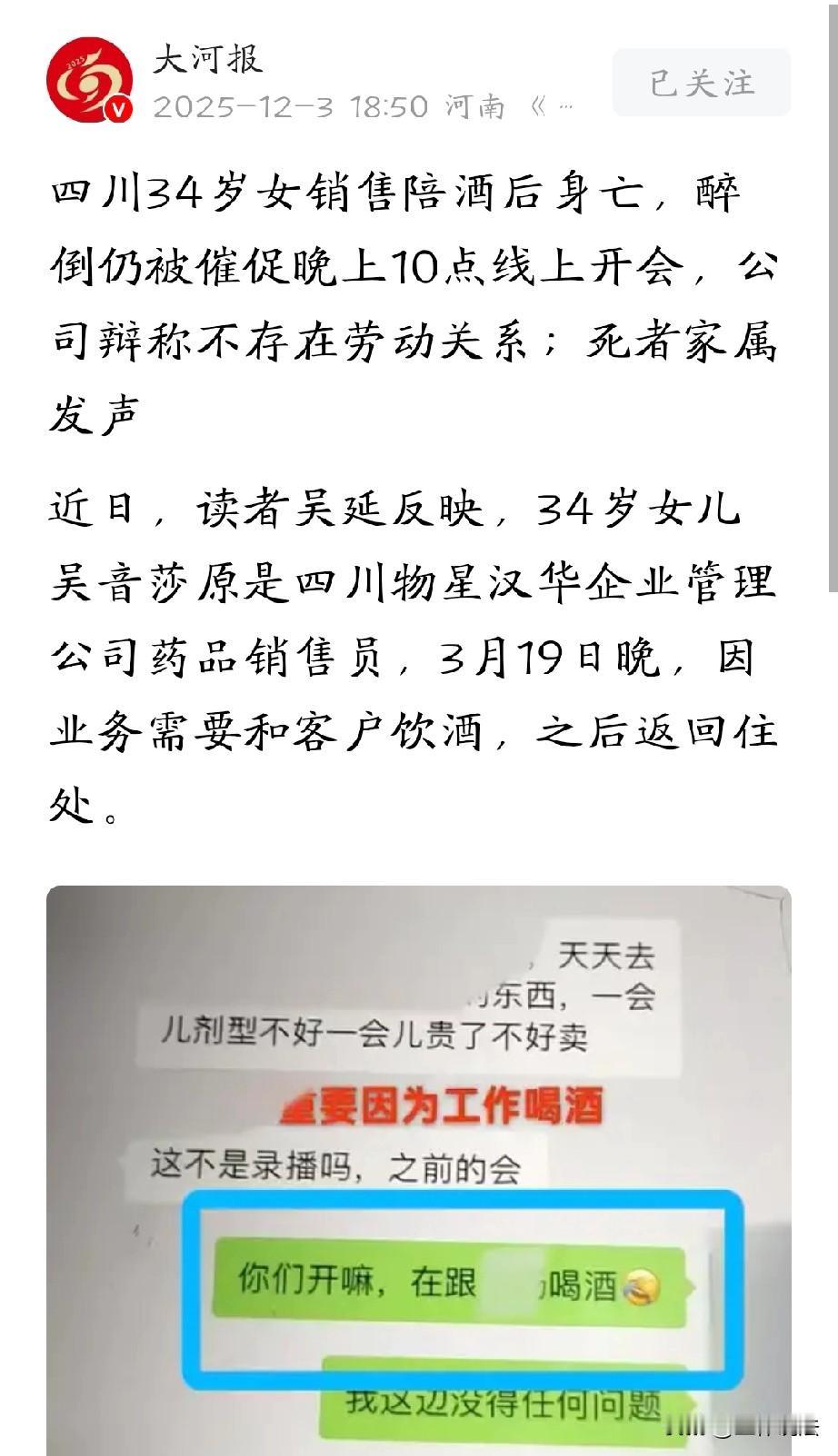 四川,34岁女销售为了完成业绩,陪客户推杯换盏,喝得晕晕乎乎后,负责人还催促她参加晚上10点多的线上会议。次日下午,室友竟惊恐的发现,女销售没了气息。为了业绩搭上了年轻的生命,家属悲痛欲绝,找公司讨要说法,希望认定为工伤。谁知公司竟翻脸不认账,矢口否认双方之间存在劳动关系。女子家属瞬间怒了,申请了劳动仲裁。 34岁的女子小吴在一家公司做药品销售员,她本和所有年轻人一样,为了更好的生活,拼命工作,可万万没想到,命运却给了她沉重一击。 3月19日晚上,为了完成业务,拿到更多的奖金,小吴端起酒杯,陪着客户推杯换盏。 她心里其实并不愿意,可为了能多挣点钱,再加上现在的就业环境如此恶劣,一不留神,饭碗就丢了,所以她只能强颜欢笑,一杯接一杯地喝。 应酬过程中,她还接到公司通知,催她赶紧搞定客户,晚上10点还有一场线上会议,小吴实在是心神俱疲。 好不容易熬到酒局结束,她喝得头晕眼花,颠三倒四,强撑着拖着沉重的步伐回到住处。 本想着,赶紧洗漱休息,睡醒之后又得继续为生活忙碌,谁知,这一觉竟成了永别。 第二天下午,室友发现平时像打了鸡血的小吴怎么一直在睡觉,走过去准备叫她起床,可喊了好几声都没反应,仔细一看,这才惊恐地发现,小吴已经没了气息。 小吴的母亲吴女士接到这个噩耗时,整个人瞬间瘫倒,她怎么也无法相信,前一天还在和自己通电话的女儿,就这样突然离开了人世。 女儿才34岁,是最好的年纪,她就这么走了,一句话也没留下,她的后半辈子,只能孤苦无依,这种白发人送黑发人的痛苦,让吴女士心如刀绞。 悲痛之余,吴女士仔细回想女儿生前的情况,她推断,女儿的死和那场应酬饮酒脱不了干系。 而且,从女儿生前的聊天记录可以看到,应酬当晚10时多,公司负责人还在喊女儿上线开会。 孩子为了业绩,喝了那么多酒,人都懵了,还要被喊去开会,这公司根本就不把我员工当人看。 她越发觉得,女儿就是为了给公司拉业绩才如此拼命,最后落得这样的下场,公司应该认定工伤,对女儿的事负责。 于是,吴女士找到公司讨个说法。可万万没想到,公司的态度却让她寒心又气愤。 公司不但不承担赔偿责任,更可气的是,竟然拒绝承认与小吴存在劳动关系,试图撇清一切关系。 吴女士气得浑身发抖,没想到这么大的企业,竟然如此太不负责任,出了事不敢承认,太没担当了。 员工为了公司的业绩,陪客户喝酒搭上了命,你们一句不承认就想了事,根本就没把员工当人看,就是把她们当牛马。 面对公司的无赖行径,吴女士没有放弃,申请了劳动仲裁。 《劳动合同法》第七条规定:用人单位自用工之日起即与劳动者建立劳动关系。 该法条明确劳动关系的建立以“用工”为核心标准,而非以签订书面劳动合同为前提。 仲裁委员会迅速介入调查,经过细致的查证发现,虽然公司没有和小吴签订劳动合同,但通过聊天记录、任职通知等一系列证据,明显可以确认,双方劳动关系成立。 即便无书面合同,只要存在用人单位管理、劳动者提供对应劳动的用工关系,就应认定劳动关系成立。 白纸黑字面前,本以为公司会承担起赔偿责任,谁知,公司一直选择了沉默,始终不给出正面回应。 已经确定了劳动关系却不担责,简直没天理了,吴女士又气又急。 目前,她计划申请工伤认定,希望能通过法律途径,为女儿讨回说法。 如今不少企业眼里只有业绩和效益,疯狂给员工施压,把员工当赚钱工具,根本不管员工死活。 34岁的小吴就是被压垮的典型,为了业绩,为了碎银几两,葬送了自己年轻的生命,打工人太不容易了。 那么,从法律角度来看,小吴的情况可以认定为工伤吗? 《工伤保险条例》第15条规定:职工有下列情形之一的,视同工伤:(一)在工作时间和工作岗位,突发疾病死亡或者在48小时之内经抢救无效死亡的;(二)在抢险救灾等维护国家利益、公共利益活动中受到伤害的…… 小吴的死亡,虽然发生在回家后,但其饮酒应酬、承受工作压力是明确的工作行为,这些行为与其死亡之间存在紧密联系,符合“在工作时间和工作岗位”的扩展解释。 小吴的饮酒应酬是其作为药品销售员为完成业绩、获取奖金的直接工作内容,是公司安排或默许的工作行为。 因此,应酬期间应视为其“工作时间”的延伸,而应酬现场可视为其临时的“工作岗位”。 即便她回到住所后去世,其死亡结果与工作期间的应酬行为存在直接的因果联系,故可视为在工作岗位上的突发疾病。 小吴在大量饮酒后,出现头晕眼花等身体不适,并最终在睡眠中死亡,符合“突发疾病”的特征。 所以,小吴的悲剧可以认定为工伤,公司应该承担相应的赔偿责任。