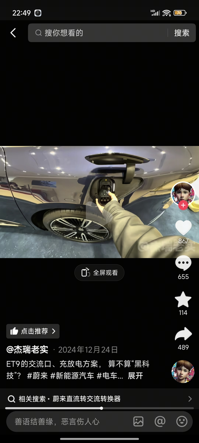 新款ES6可以使用慢充 其实就是ET9的技术下放,快充口转接器,可以用上交流口(俗称慢充口)充电了,这个转接器还带220V放电功能,就是不知道买车时候会不会标配给车主!