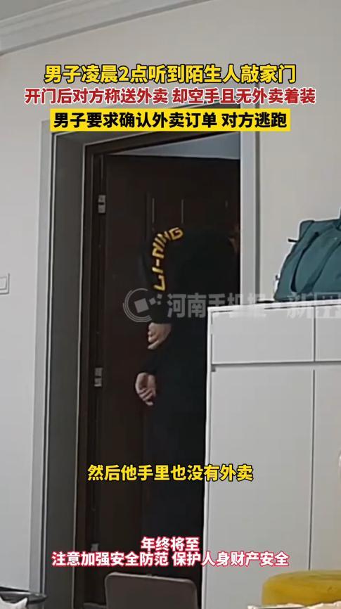 “太吓人了!”近日,河南郑州,一男子凌晨2点刚准备睡觉,忽然听到门口有人在尝试开门,他从厨房拿来菜刀,壮着胆子开门查看,对方表示是送外卖的,但是手里却空无一物,也没有穿外卖服装,随后就跑了。网友:年底一定要小心! 这一年又快要结束了,不少人已经开始收拾行李,准备回家过年了,而在此期间,大家一定要注意安全,因为有些没赚到钱的人开始想办法了。 据媒体12月3日的报道,张先生是位电商从业者,平日里处理订单需要忙碌到很晚,那天晚上,他又忙到2点多才准备休息。 可是就在张先生要躺下时,忽然听到门锁传来“识别错误”的提示音,张先生有些好奇,是不是有人走错门了,他本不打算过去的,可是门外的人似乎一直在尝试密码。 最终张先生鼓足勇气,去厨房拿了把刀然后走到门口,门外的人见屋里的灯亮了,立即躲到了楼梯口,张先生开门询问对方干嘛的,男子就说是送外卖的,张先生觉得有问题,就要查看对方的订单信息,没想到男子直接撒腿跑了。 张先生第一反应是追了出去,但是发现没拿手机就又回去了,等再出去时人已经不见了踪迹。 独居的人一定要注意安全,尤其是女性,很多小偷会提前踩点,大家在发现有可疑的人按门铃后一定要注意,建议联系物业或者报警。 信息来源:《12月1日(原创采访),河南郑州,男子凌晨2点听到陌生人敲家门,开门后对方称送外卖,却空手且无外卖着装,男子要求确认外卖订单,对方逃跑。》新界视频