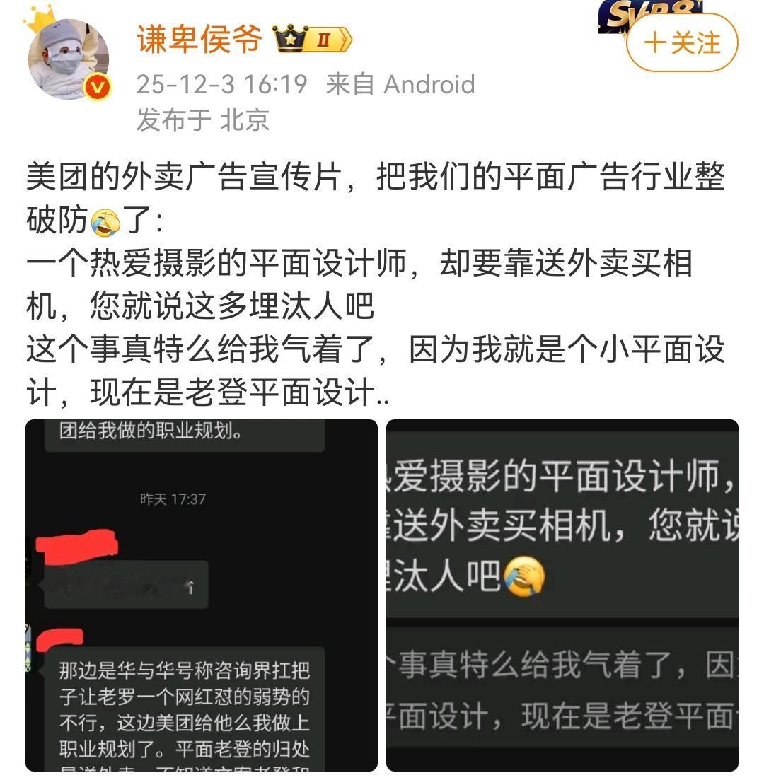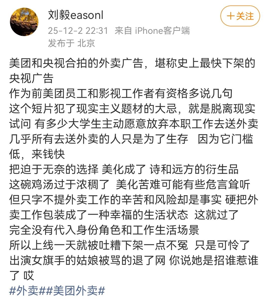 某团广告,宣传过头了。 (如图所示)某团出品的有关快递员幸福生活的广告引起非议,被快速下架。广告争论的焦点是:快递员每日风里雨里、风驰电掣,到底是为了欣赏沿途的风景,还是在算法的计算下,为生活拼命地奔波?