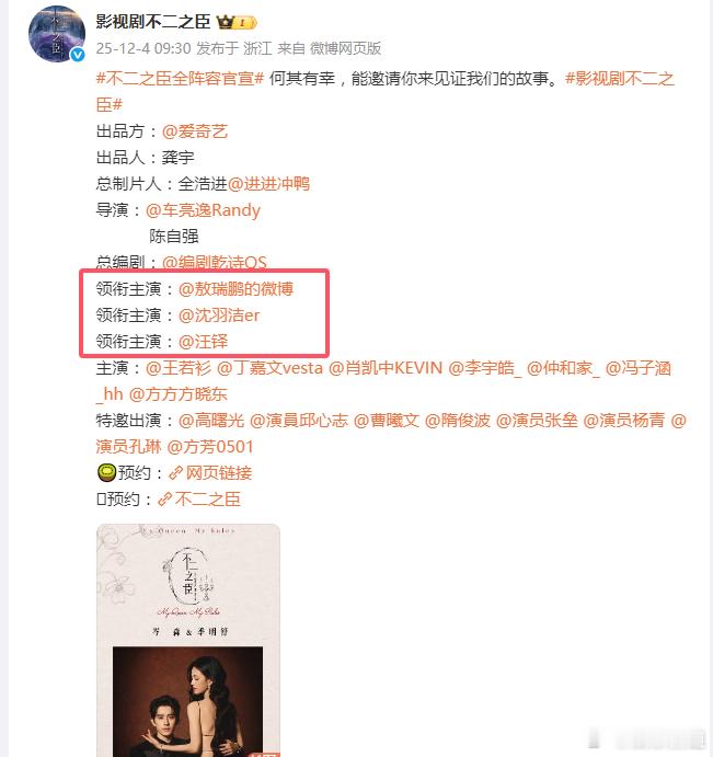 敖瑞鹏沈羽洁汪铎领衔主演不二之臣《不二之臣》全阵容官宣,敖瑞鹏沈羽洁汪铎合作,这