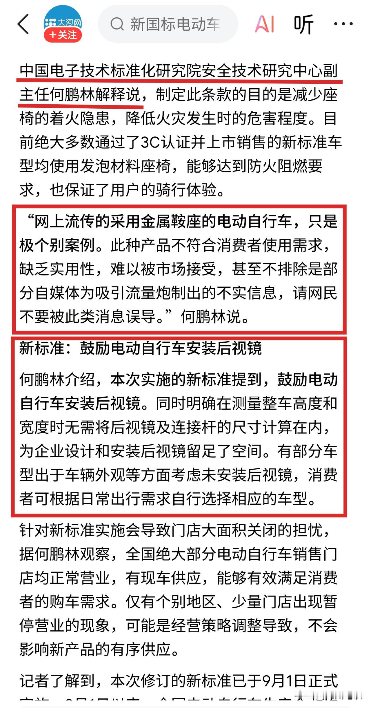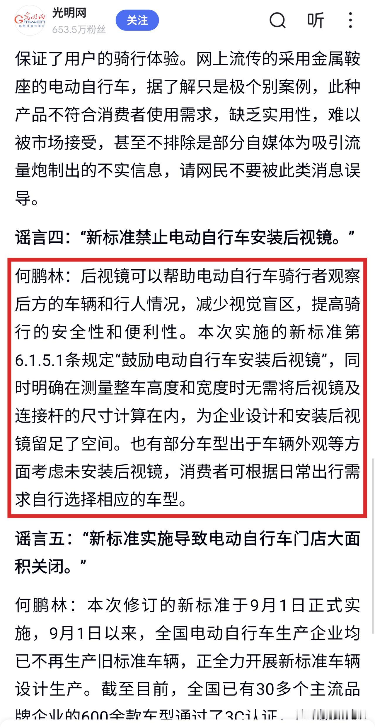 【被误解的新国标】电动自行车新国标主要起草单位专家现身辟谣:电动自行车鼓励安装后视镜!!! 不要被厂家和门店以及不明真相的部分人误导了! 其实标准制定单位和厂家都是为了消费者好。 一是标准不计算后视镜的高度和宽度,鼓励安装后视镜。 其中2018版是不计算高度,2024版高度和宽度都不计算。 二是厂家预留安装接口,人性化设计! 厂家不安装后视镜是为了减轻重量,避免超重,毕竟后视镜也差不多有一公斤重了,寸土寸金!厂家把重量给了其他更重要的地方,例如车架强度,电池容量增加续航更受欢迎。 一般厂家都是预留了后视镜安装接口的,上牌后直接把后视镜弄上去就可以了。 笔者的2018版新国标的电动自行车,合格证也没有后视镜,但送后视镜,待上牌后自己装上去就可以了。 其实根本不用担心后视镜、靠背这些配件。从来没有听说哪里会查后视镜的和靠背的。 装大尾箱可能就不一定了。 装中箱是一定不允许的,因为改变了车辆结构,影响安全。