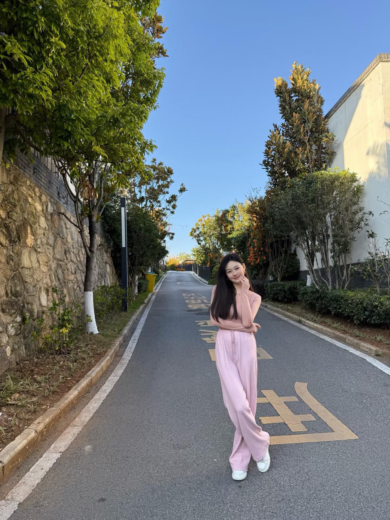 她漫步在花草簇拥的乡间小路上,阳光为她的身影镀上温柔光边。发丝随风轻扬,步伐从容