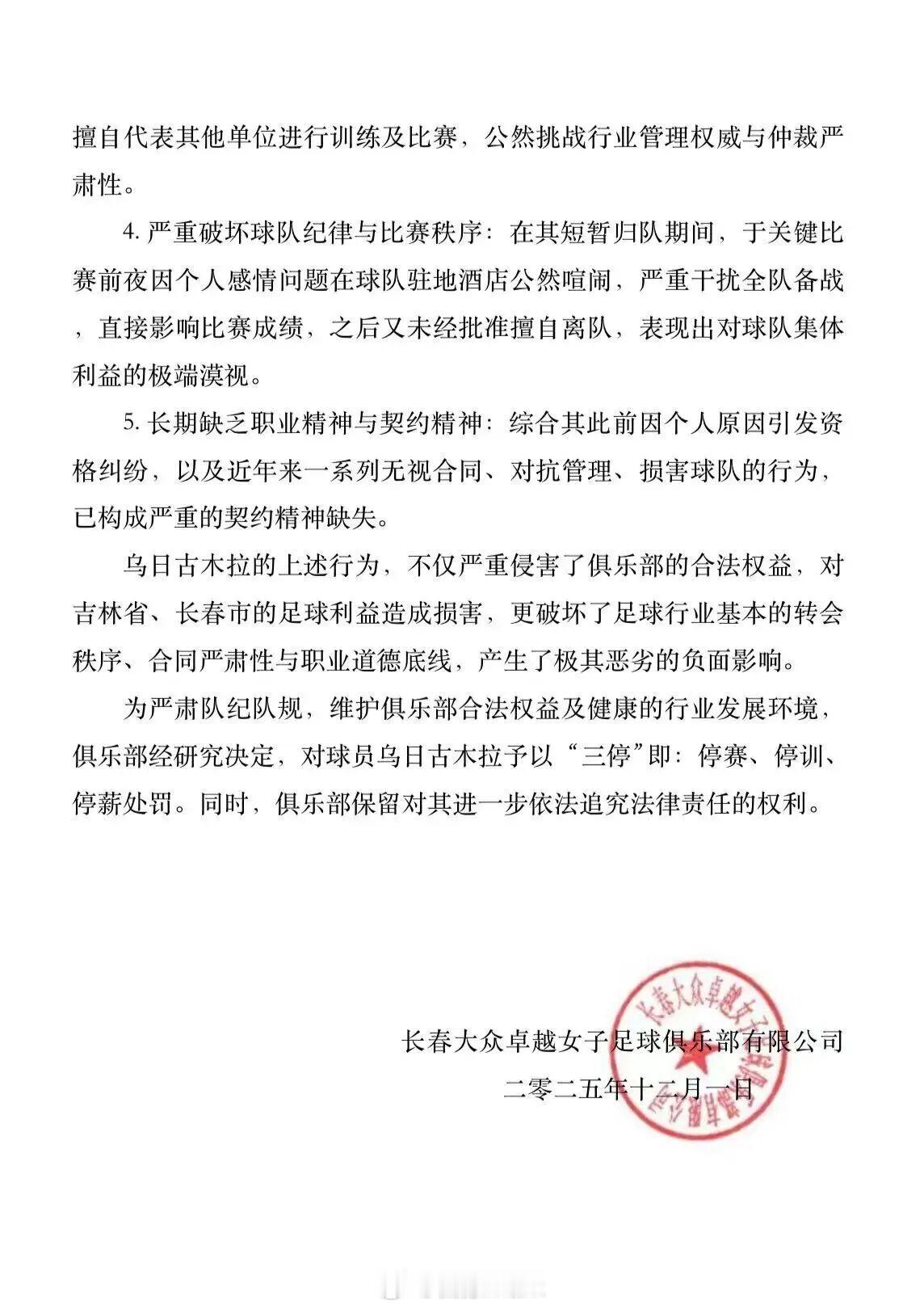 长春大众卓越女足俱乐部发布官方通报,针对球员乌日古木拉长期、多次严重违反合同约定、破坏球队纪律、损害俱乐部形象的行为,决定继续对其处以停赛、停训、停薪的“三停”处罚。公告列出了对该球员作出处罚的具体理由,措辞很严厉:1. 严重违反合同与租借约定:2023年5月,俱乐部基于支持球员个人发展的考虑,同意其租借至海外俱乐部,并明确约定归队期限。然而,该球员在2024年5月租借期满后,无视合同义务,拒绝按期归队。2. 私自接触并签约第三方:在与俱乐部合同存续期间,该球员未经许可,私下与国内其他足球单位签署协议,意图代表其参赛,严重违反《中国足球协会球员身份与转会管理规定》。3. 对抗行业生效裁决:针对其违约行为,中国足球协会纠纷解决委员会及中国体育仲裁委员会已先后作出裁决,明确要求其必须继续履行与俱乐部的合同。但该球员在裁决生效后仍拒不执行,继续擅自代表其他单位进行训练及比赛,公然挑战行业管理权威与仲裁严肃性。4. 严重破坏球队纪律与比赛秩序:在其短暂归队期间,该球员于关键比赛前夜因个人感情问题在球队驻地酒店公然喧闹,严重干扰全队备战,直接影响比赛成绩,之后又未经批准擅自离队,表现出对球队集体利益的极端漠视。5. 长期缺乏职业精神与契约精神:综合其此前因个人原因引发资格纠纷,以及近年来一系列无视合同、对抗管理、损害球队的行为,已构成严重的契约精神缺失。