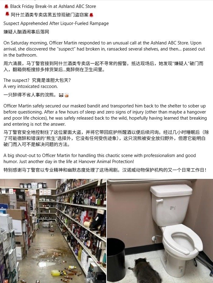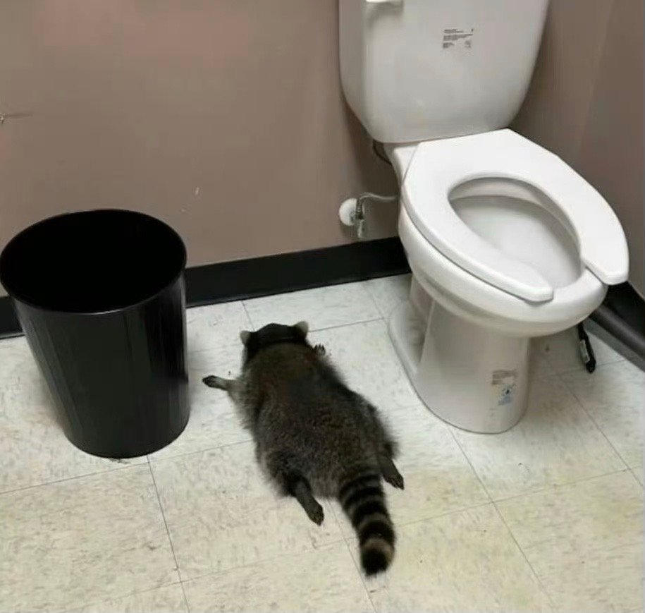 小浣熊偷喝商店烈酒后醉倒在卫生间还挺讲卫生,知道要去厕所吐。