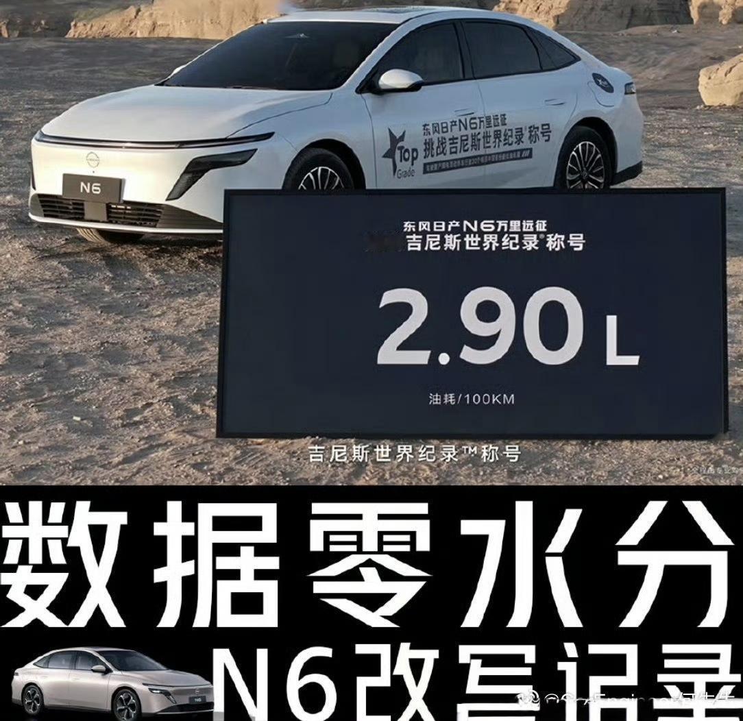 万里远征插混第一车 日产N6又搞了个世界吉尼斯纪录,插混最低油耗,全程1.4万公里,不过有5200米海拔落差!!从拉萨出发把中国跑了个遍。 全程没有充电,也没有条件充电,加油9次,最终的油耗是百公里2.9L。 跑油耗世界吉尼斯纪录,吉利干过,荣威干过,这些10万左右的车,对油耗还是挺在意的。 无论是买来当网约车开还是家用车,家用A级车最重要的是日常使用经济性,得省油,保养费用得低。 日产N6这车,平时使用成本挺低的。【来自懂车帝车友圈】
