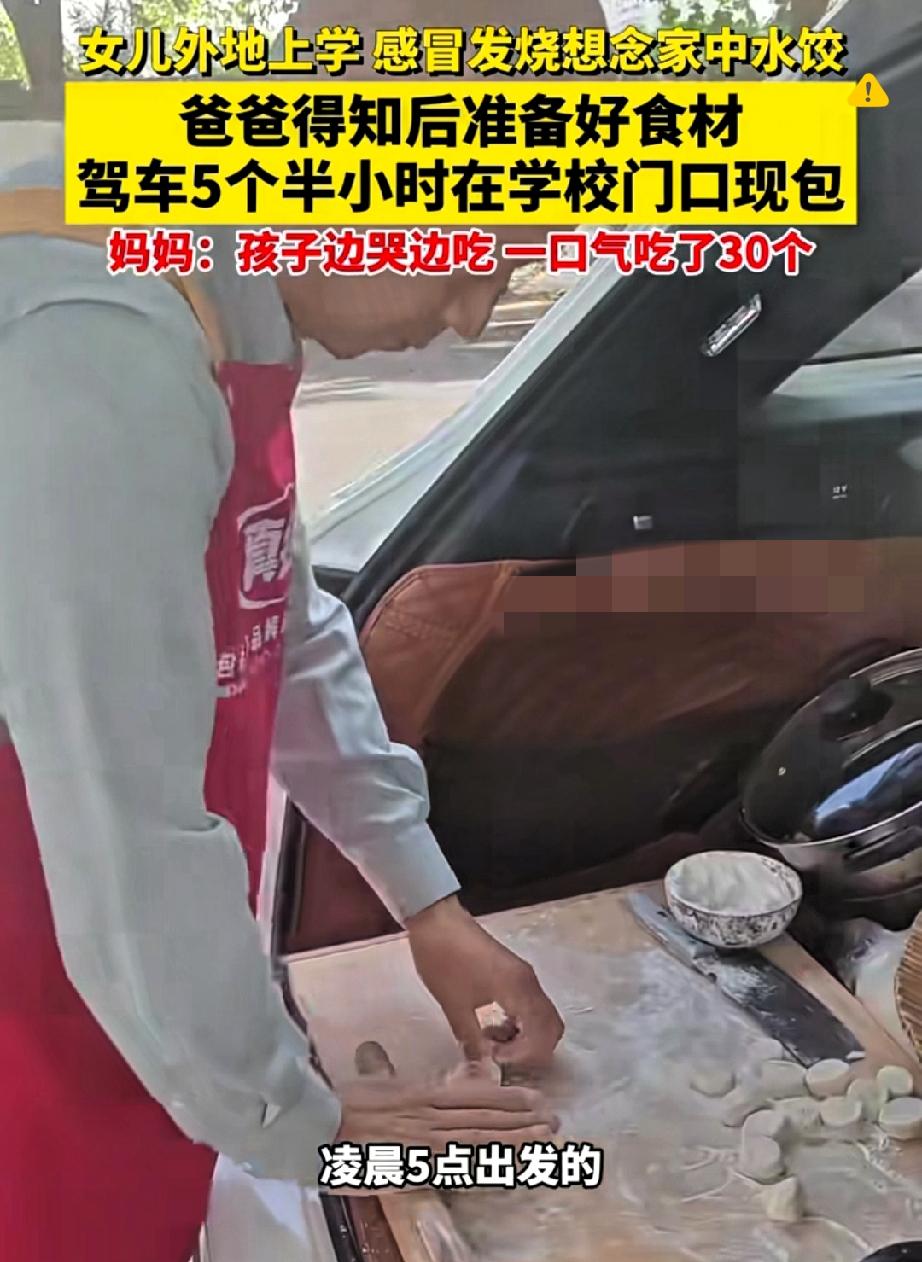 看哭了家人们! 山东爸爸的爱太戳心了! 女儿南京上学感冒发烧,念叨想吃家里的白菜熟肉水饺,他凌晨5点驾车5小时赶去,在车后备箱现场擀皮、包饺子、煮水饺,这份笨拙又滚烫的爱,比任何特效药都管用。 女孩边哭边吃一口气炫30个,喊着“就是这个味”,其实她馋的哪里是水饺,是爸妈掌心的温度和家的安全感啊。 现在外卖、快递再便捷,也送不来这份带着风尘仆仆的牵挂,父母的爱从不是花言巧语,而是把你随口的念叨,当成最重要的事。 那些说不出口的心疼,都藏在亲手做的饭菜里,这才是无法复刻的独家温暖。 你有没有过被爸妈这种“突然的爱”打动的瞬间? 他们曾为你做过哪些看似平常却超暖心的事?快来评论区说说~