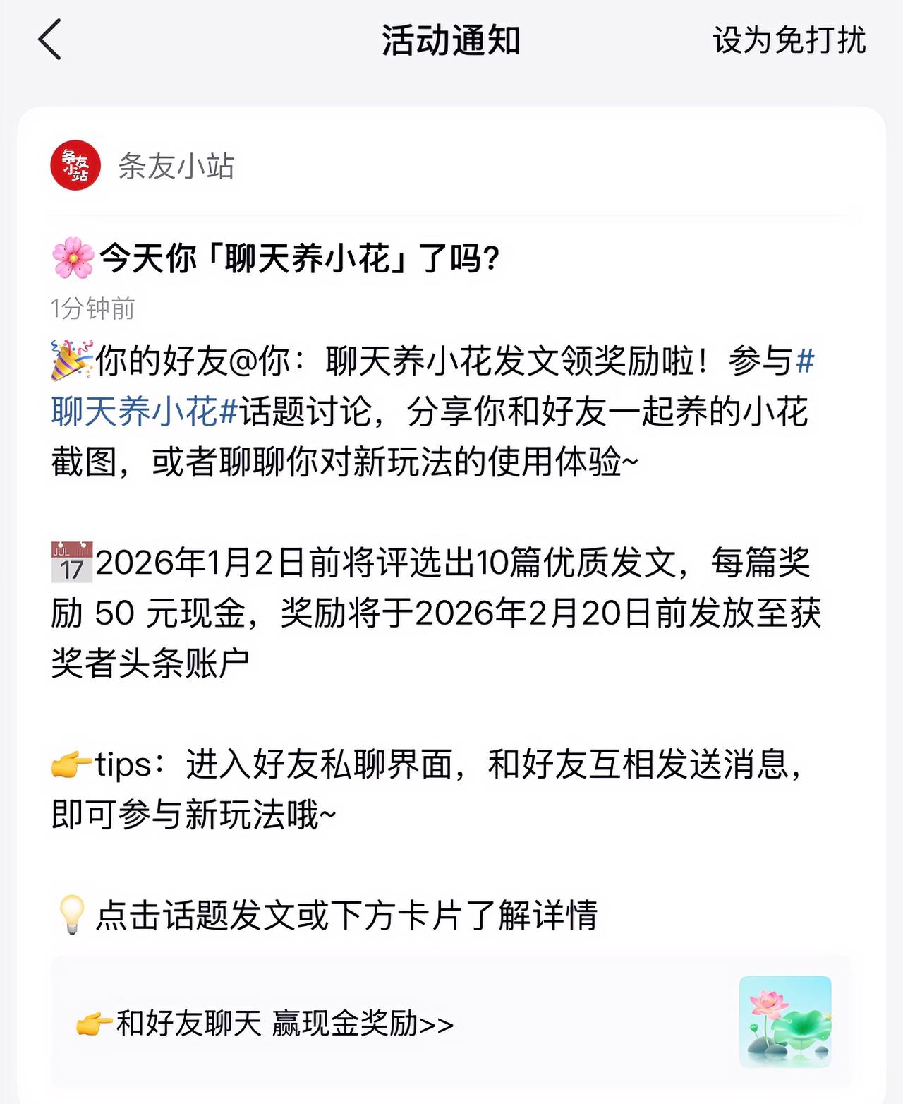 “聊天养小花,赢现金奖励!”🌸💰头条官方邀请我参加聊天养小花发文赢现金奖励!分享和头条好友一起养花截图,或者聊聊对新玩法的使用体验。 在2026年1月2日之前评选10篇优质所发图文,每篇奖励50元现金,奖励将于2026年2月20日前发放给获奖者头条账户。头条的友友们你们都收到了这样的通知了吗?
