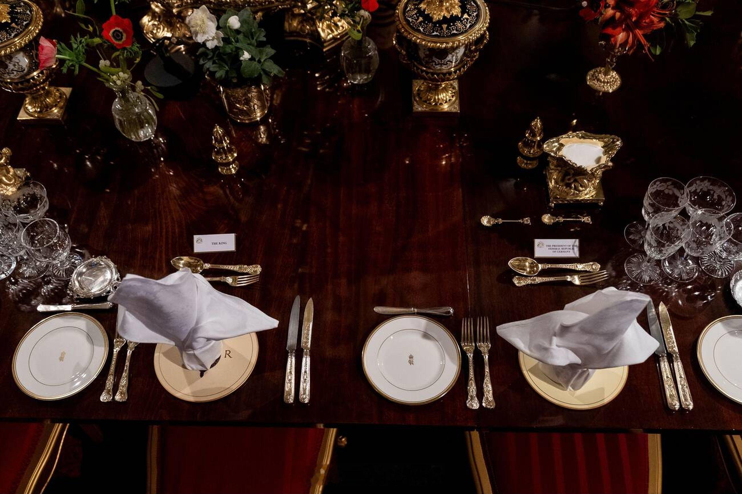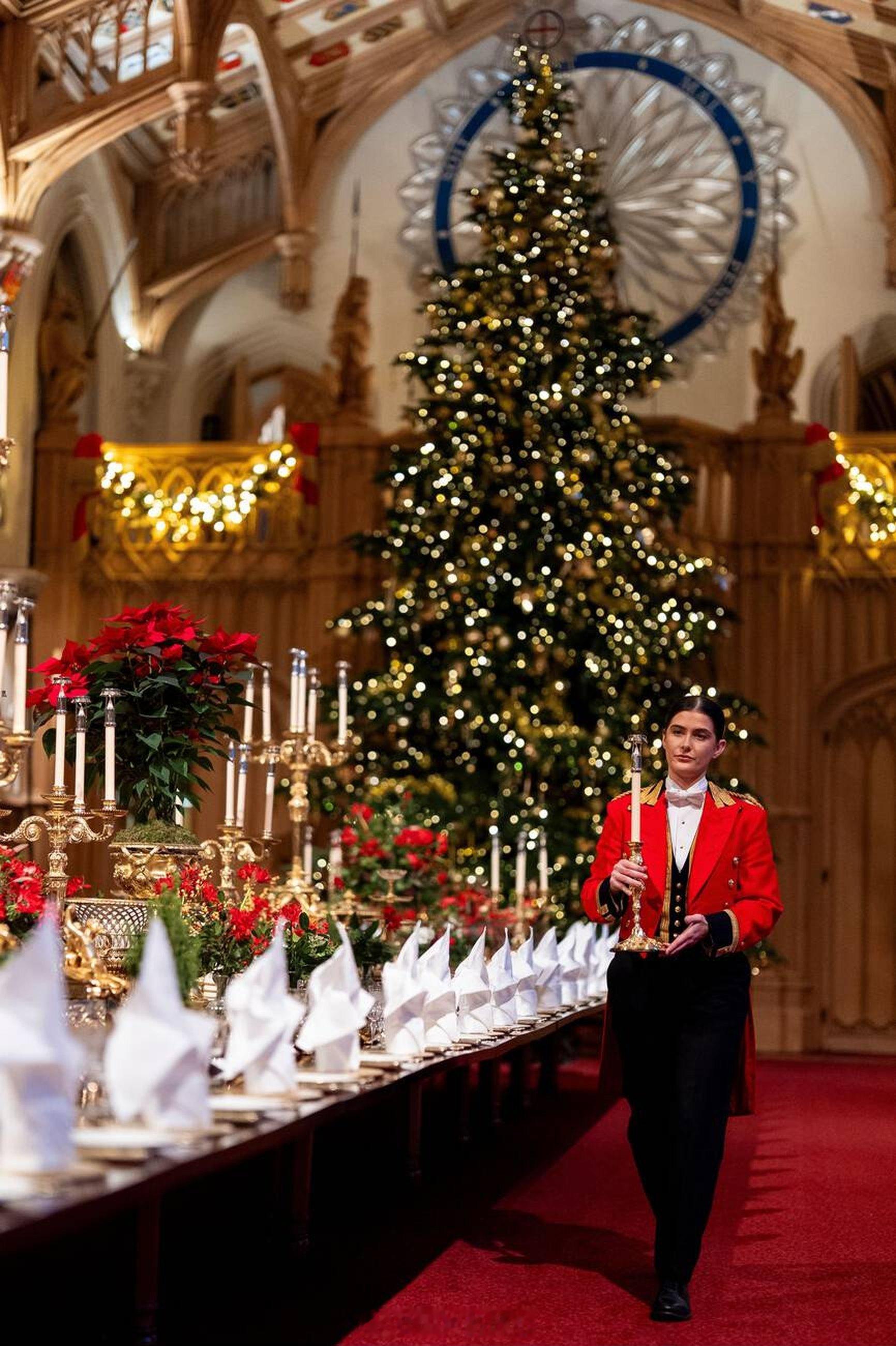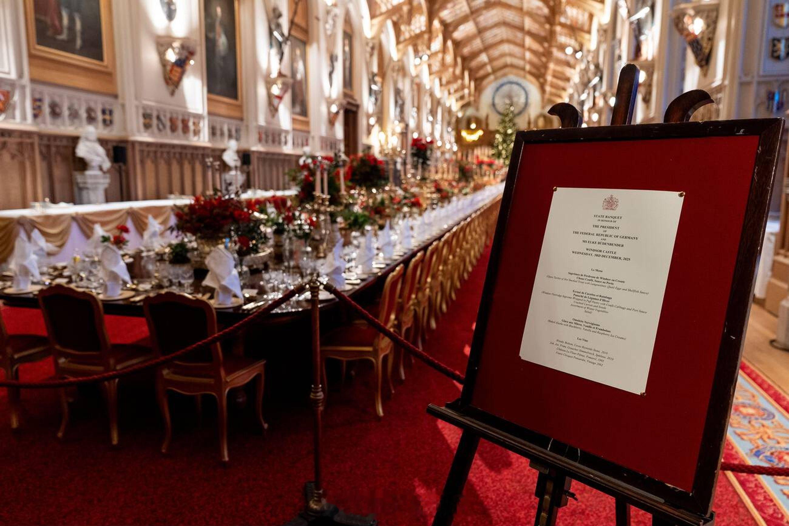2025年12月3日,查尔斯三世和卡米拉王后在温莎城堡圣乔治大厅主持德国国宴,威