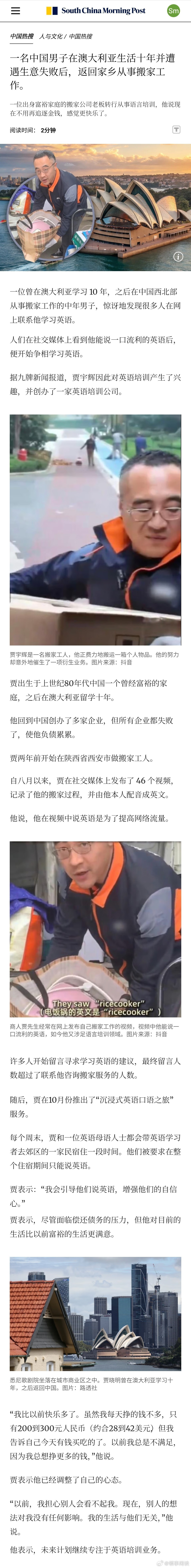 【一名中国男子在澳大利亚生活十年并遭遇生意失败后,返回家乡从事搬家工作】