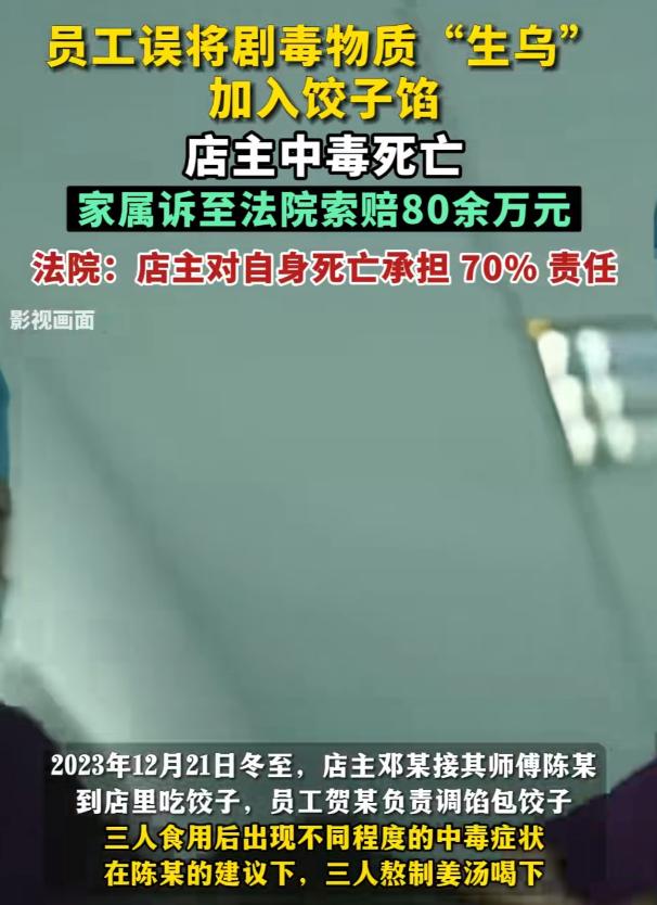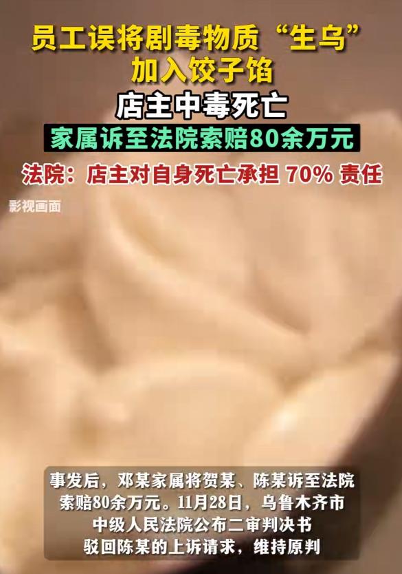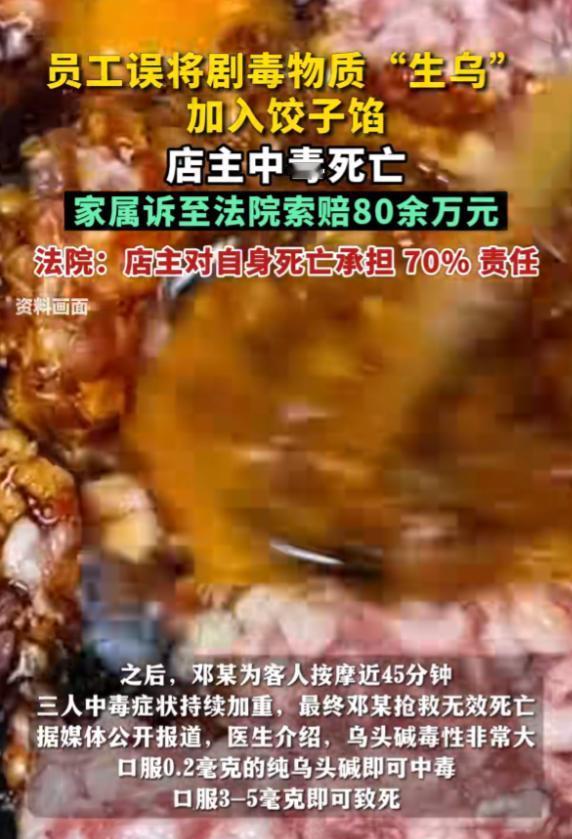 新疆乌鲁木齐,冬至当天,推拿店店主邀请师傅过来吃饺子,店员包饺子时误将店主放在一起的生乌粉当成黑胡椒加入了饺子馅,随后三人中毒,但是并没有做正确处理,店主还去为一个顾客按摩了45分钟。此后三人情况越来越严重就医,第二天,店主不治身亡。事后,家属起诉师傅和店员索赔80余万。 乌鲁木齐新市区的一条街上,邓某的推拿店开了有些年头,凭借着知道一些专业的医学知识,他的生意可以算是风生水起。 2023年冬至这天,邓某特意提前采购了食材,让技师贺某准备包饺子,自己则开车去接自己的师傅陈某,想趁着节日好好叙叙。 贺某手脚向来勤快,她把面粉和好醒着,转身就开始处理馅料。 在调馅的时候,一大堆调味品中间一个没贴明显标签的小玻璃瓶引起她的注意,里面装着棕褐色细粉,颗粒和颜色都与常用的黑胡椒极为相似。 贺某也没多想,拿起勺子舀了四勺就拌进了肉馅里。 等邓某带着陈某回来时,已经煮好了90多个饺子,香气飘满了小店。 热腾腾的饺子端上桌,三人边聊店里的生意边吃,没几分钟就把盘子扫空了。 最先察觉不对的是陈某,他放下茶杯说腿有点发麻,话音刚落,邓某就捂住了胸口,说心跳得厉害,贺某这时也感觉额头冒冷汗,手脚发沉。 两个懂医的人对视一眼,立刻意识到可能是食物中毒。 邓某赶紧拉着贺某去操作台辨认,当贺某指向那个棕褐色粉末瓶时,邓某脸色瞬间惨白。 那瓶子里装的是“生乌”粉末,是推拿店用来辅助理疗的药材,含有剧毒的乌头碱,但是邓某却把它和平常的调味品放在了一起。 这种毒素口服0.2毫克就会引发中毒,剂量达到3到5毫克就足以致命。 几人还没有来得及就医,预约的顾客就推门进来了。 邓某看着等候的顾客,想着不能砸了店里的口碑,咬着牙戴上手套开始按摩,这一撑就是四十五分钟。 送走顾客后,三人的中毒症状已经全面爆发,恶心呕吐不止。 直到下午六点,120的电话才被拨通 尽管医院采取了洗胃、血液净化等急救措施,但邓某中毒后持续体力消耗,加速了毒素在体内的扩散,错过了黄金抢救时间,第二天凌晨抢救无效宣布死亡。 贺某和陈某因为食用量较少,且中途没有剧烈活动,最终脱离了生命危险。 痛失亲人的家属将贺某和陈某告上法庭,提出了八十余万元的赔偿诉求,认为贺某误加毒药、陈某延误救治,两人应为邓某的死亡负主要责任。 法院开庭审理时,重点核查了三方的过错细节,最终给出了责任划分。 法院认定邓某承担七成主要责任,作为具备医学知识的经营者,他明知“生乌”剧毒,却未将其与食品调料分区存放,这是悲剧的根源。 确认中毒后,他坚持工作,直接导致救治延误。 贺某承担两成责任,作为操作者,她的投放是中毒事件的直接诱因。 陈某承担一成责任,作为专业医师,他在得知中毒情况下,没有采取正确措施,加剧了损害结果。 一审判决贺某赔偿二十四万余元,陈某赔偿十二万余元,陈某上诉后,二审维持了原判。 这场悲剧本可以避免,要是邓某当初把药材和调料分开存放,要是贺某调馅时多问一句、多确认一下,要是中毒后三人能第一时间去医院,而不是硬撑着工作,邓某也不会丢了性命。 生活里不少小店铺都像当初的推拿店一样,东西怎么放、事情怎么干全凭经验,平时看着没事,可一旦出问题,就是没法挽回的代价。 把该分开的东西分开,发现异常赶紧正确处理,这从来不是麻烦事,而是能守住安全的大事。 安全从不是“差不多就行”的小事,有毒物品单独存放、不明情况及时核实、突发状况科学处置,这些看似繁琐的细节,恰恰是守护生命的防线。