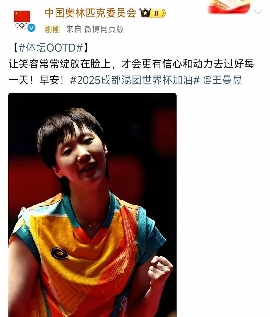 巴黎奥运单打名额的遗憾,曾让无数人替王曼昱惋惜,但这个倔强的姑娘从没抱怨过一句。 选拔周期里从落后到反超,再到最后关头的遗憾,她把所有情绪都藏在训练馆的汗水里,默默打磨技术、磨合团队,连体能训练都在想办法创新提升。 没有惊天动地的宣言,只有“全力以赴不后悔”的坚持,这种在低谷里依然向上的韧劲,才是体育精神最动人的模样。 官博的力挺,既是认可也是期许,哪怕不是单打赛场,她的每一次登场都值得期待。