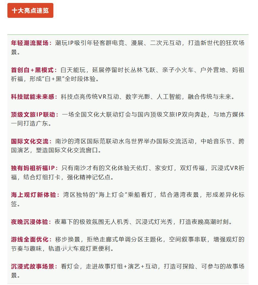 【南沙2026年灯会时间和地点定了!】期待的2026年南沙第二届粤港澳大湾区灯会终于定了!灯会将于2026年2月10日—5月10日在南沙天后宫景区以及滨海公园举行,展期共90天。 本届灯会以“科技赋能文化传承,创新驱动品牌发展”为核心理念,植入更多科技、光影元素,与外部热点IP联动,并联动地方媒体一同打造广东灯会春晚。 目前,新一年的灯会招商工作已全面启动。官方表示2026年粤港澳大湾区灯会计划整合近百家媒体资源,通过全域渠道精准触达湾区及全国游客。活动预计将实现超50亿人次的品牌曝光,将为广大合作商家提供绝佳的品牌宣传和展销机会。 我估计大家关心的是灯会还是在滨海公园举行吧,考虑到灯饰要提前安装,建议大家在剩下的12月想去滨海公园和天后宫小沙滩的就快点去吧,不然下次又得等大半年了。