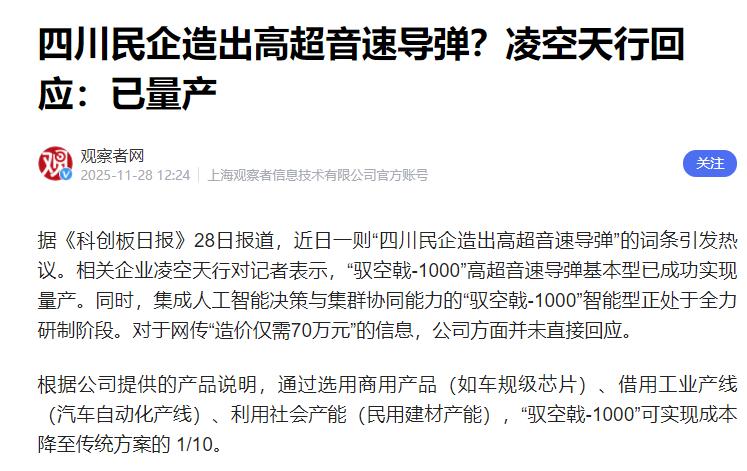 美国估计这回没脸见人了,因为被中国用水泥狠狠地打了脸! 谁能想到,让美国高超音速导弹项目卡壳的“拦路虎”,居然被中国用一袋水泥给解决了?这事儿说出来可能有人不信,但凌空天行“驭空戟-1000”的亮相,直接给全世界上了一课。 高端武器不一定非得靠“高大上”的材料堆出来。美国那边为了找轻巧又耐高温的材料愁得头发都白了,测试屡屡失败,咱们这边倒好,用改性发泡水泥就搞定了防热层,还顺便把成本干到了东风系列的十分之一,这波打脸真是又狠又实在。 先说说美国为啥会被气到。他们搞高超导弹好几年了,一直卡在高温防护这个坎上。导弹重返大气层时,7马赫的速度会让外壳温度飙升到上千度,既要扛住高温又得兼顾轻量化,美国找了几百种航天级材料都没搞定,风洞模拟看着挺美,一实际测试就掉链子。 结果咱们这边倒好,没走寻常路,直接把水泥改性后用在了发动机外壳、控制翼面这些关键部位,耐热温度刚好够得上800到1000℃的要求,完美适配一次性使用的导弹场景。 这种“降维打击”式的思路,美国工程师估计想破头都想不到,毕竟在他们的认知里,航天装备就得用航天级材料,哪能想到“灰头土脸”的水泥能登大雅之堂。 这波操作能打脸美国,绝不是只靠“水泥”这一个点子,背后是整套成本控制逻辑的碾压。美国搞武器向来追求“高精尖”,零件非得用定制航天级的,成本自然居高不下。 咱们就不一样了,凌空天行直接把车规级线缆换上,测试八十多枚全成功;把爆炸螺栓换成电分离螺母,单个成本从两万砍到两千。 连结构框架都用整体压铸,几千块钱就搞定。最绝的是用工业标准件替代航天标准件,成本直接降到十七分之一。 这些操作看着“粗暴”,但武器装备讲究的是实战效果,只要打得准、扛得住,没人会纠结用的是航天级还是车规级,这种务实主义,恰恰是美国军工复合体学不来的。 更让美国难受的是,这种“低成本高性能”模式刚好戳中了他们的软肋。美国高超导弹不仅技术卡壳,就算搞出来估计也是天价,想量产都难。 咱们的“驭空戟-1000”已经实现量产,射程1300公里、速度7马赫,虽然比东风-17性能稍逊,但部署在沿海或岛屿,第一岛链、大半个日本都在打击范围内。 关键是成本控制在一百万级,比火箭弹贵点但效费比高太多,高超音速突防能力打航母、固定目标都够用,这不就是“量大管饱”的高超版“火箭炮洗地”吗? 美国在第一岛链部署再多武器,面对这种低成本饱和打击,连发射机会都没有。 其实这事儿本质上是中美军工思路的对决:美国迷信“技术堆砌”,咱们讲究“问题导向”。 水泥能逆袭成航天级防热材料,不是瞎猫碰上死耗子,而是工程师吃透了导弹一次性使用的特性,跳出“高端装备必须用高端材料”的思维定式。 这种颠覆性创新,比单纯的技术领先更让对手头疼。现在美国六代机还在画PPT,咱们已经三款试飞了;高超导弹美国还在卡脖子,咱们已经量产降价了。照这节奏,以后美国被打脸的地方,恐怕还会更多。