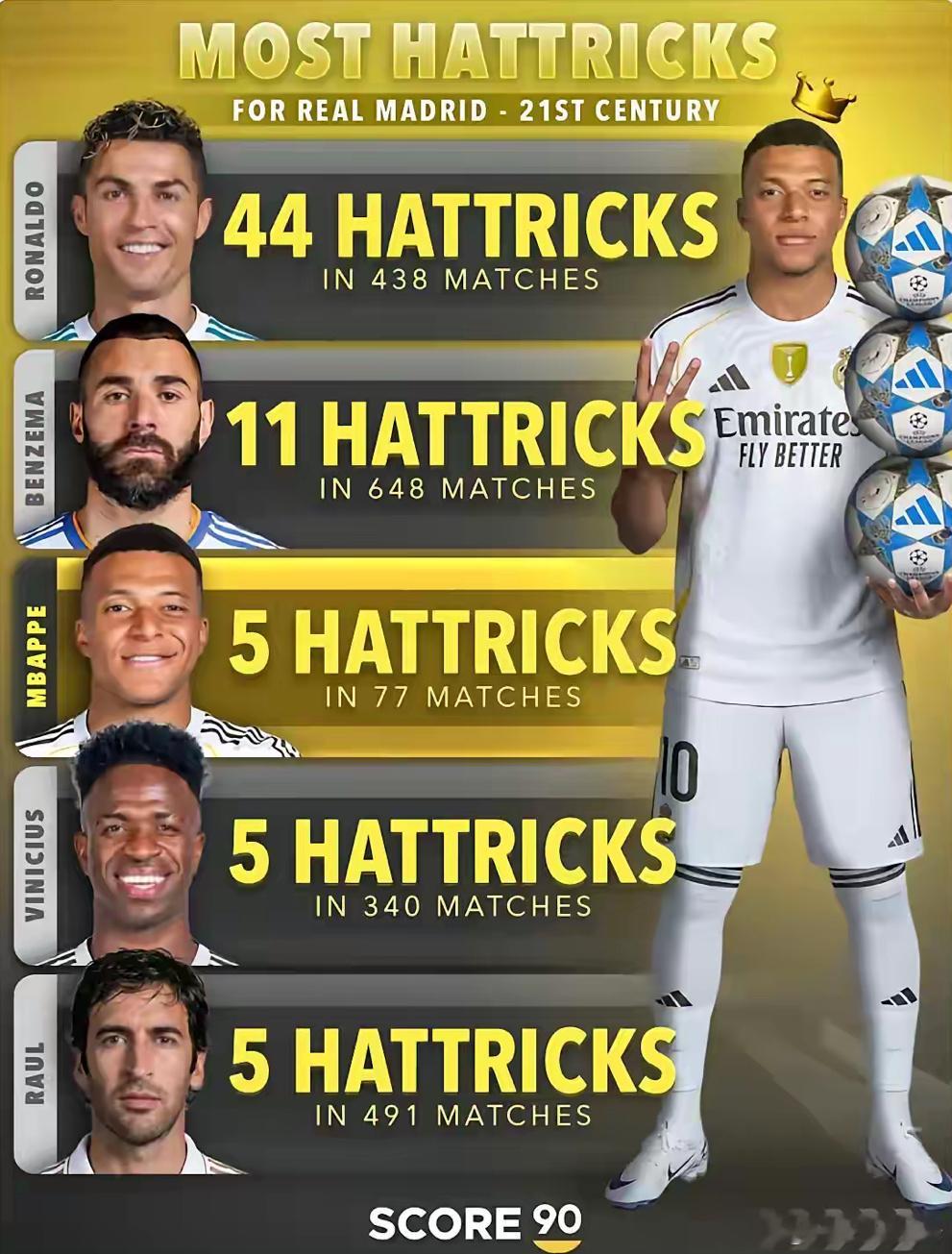 在皇马任何人别跟C罗比纪录,44次帽子戏法太多了!金球奖得主本泽马已经很牛了,才11次。姆巴佩5次帽子戏法,基本追不到C罗。所以球王C罗永远让皇马球迷怀念!