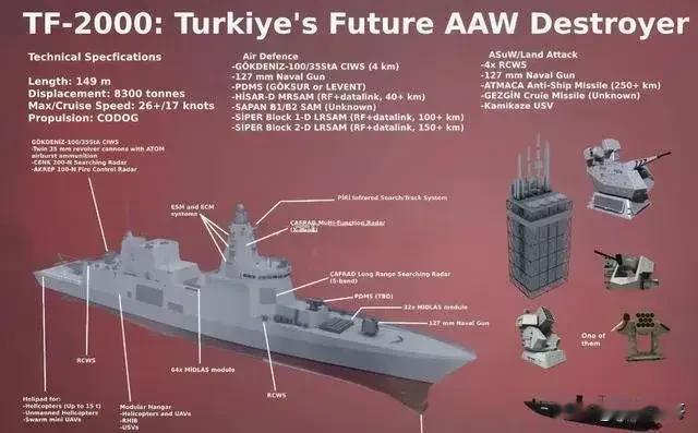 2025年11月27日,土耳其在伊斯坦布尔海军造船厂为TF-2000驱逐舰举行开工仪式,标志着该驱逐舰进入实质性开工建造阶段。 该舰舰长149米 ,舰宽21.3米,吃水5.75米,满载排水量8300吨。舰员编制180-210人,最多可达240人。武器装备:1门国产127毫米/54口径舰炮,1座35毫米双管近防炮。装备96单元MIDLAS垂直发射装置,其中前部32单元,中部64单元。垂直发射装置可兼容发射射程长达150公里的Siper远程防空导弹、Hisar-D中程防空导弹、射程达1000公里的Gezgin巡航导弹、Atmaca反舰导弹以及“阿斯洛克”反潜火箭助飞鱼雷等。1座11联装“莱文特”(土耳其版拉姆系统)近程防空导弹系统。装备2座3联装鱼雷发射装置,可发射Orka(虎鲸)轻型鱼雷。舰尾设有双机库和飞行甲板,可搭载2架10吨级的直升机。同时预留了搭载无人机的空间。 安装了ADVENT作战管理系统,可实时进行作战协调。舰上搭载的主雷达为阿塞尔桑公司的CAFRAD双波段有源相控阵雷达系统,包括S波段远程监视雷达和X波段多功能雷达,其中S波段远程监视雷达为单面旋转阵列的雷达,最大探测距离超过450公里,可探测2000个目标,整体水平接近美国“宙斯盾”雷达。电子战套件还可对抗先进反舰导弹导引头。 采用柴燃交替动力推进,装备2台美国LM-2500燃气轮机和2台德国MTU柴油发动机,最高航速可达28节,续航能力为5000海里/17节,海上自持力为45天。 该型驱逐舰计划装备8艘,首舰计划2028年下水,2030年服役。服役后将成为土耳其海军的核心装备,不仅担负护航、维护海上权益等任务,还可带动技术进步,推动国防工业升级和军工外贸发展。