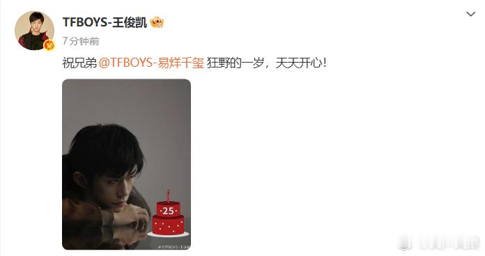 王俊凯王源祝福易烊千玺25岁生日祝千玺25岁生日快乐!从青涩少年到实力演员,你的成长我们有目共睹,新一岁愿星光不负赶路人,未来皆可期。