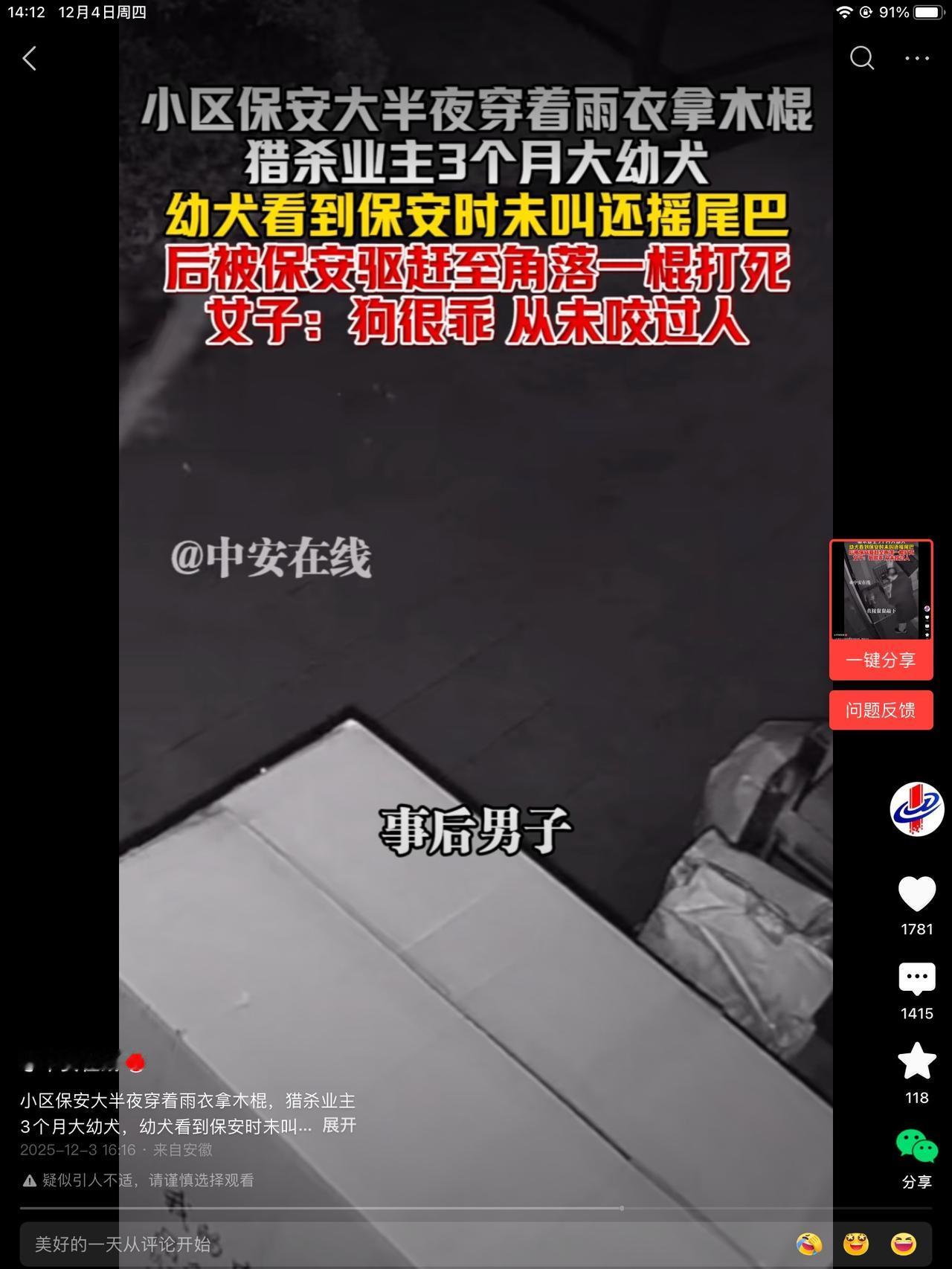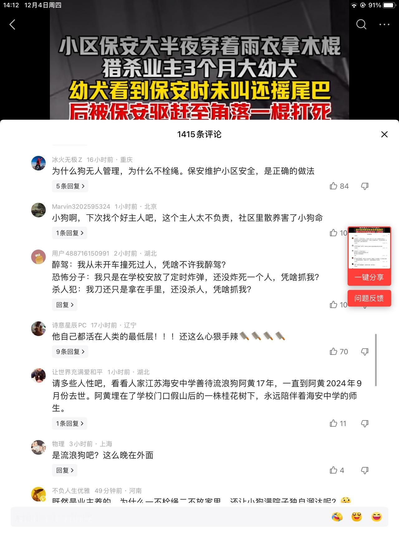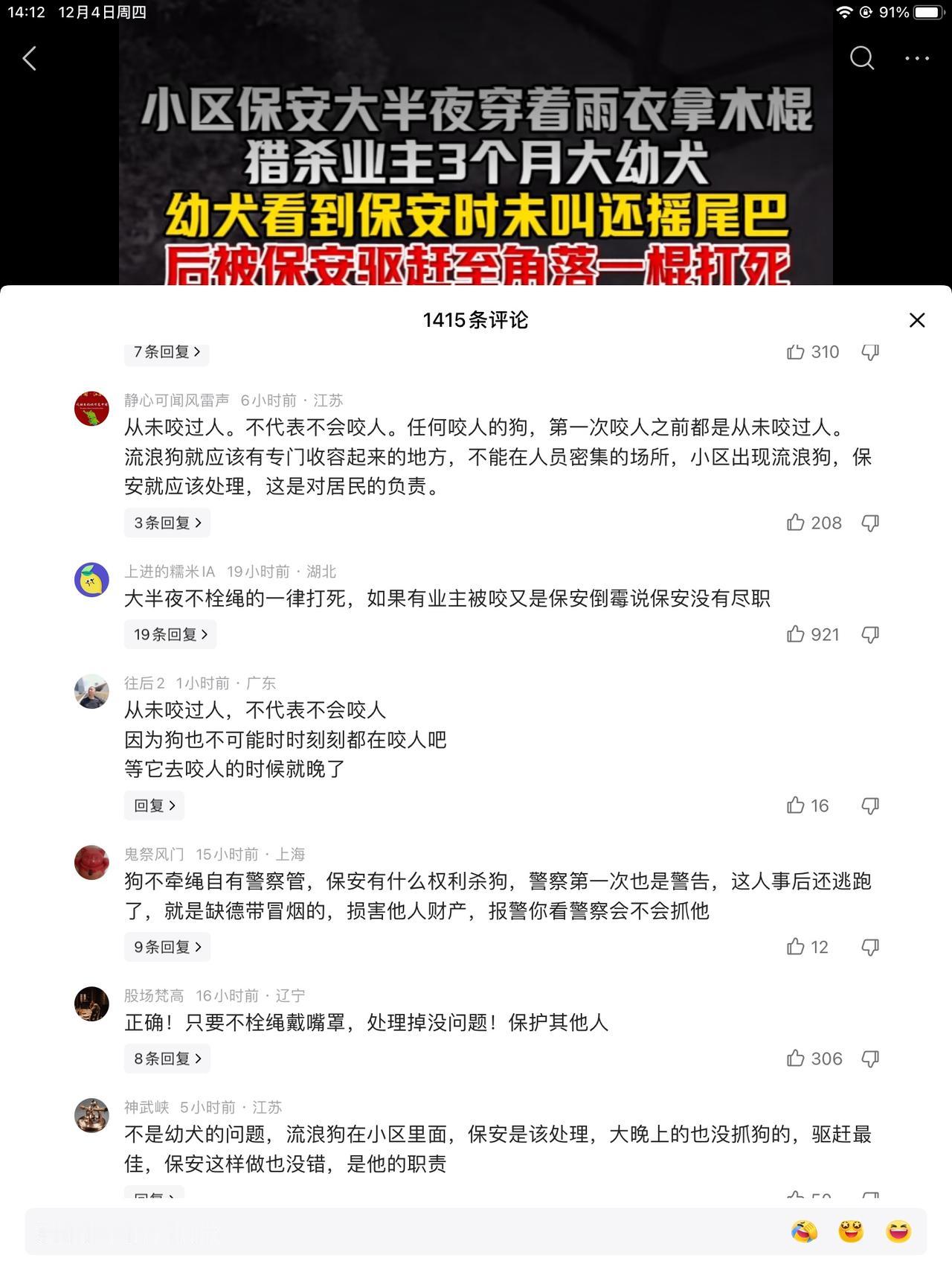 保安大爷,看见一条三个月大的小狗,没栓绳,他值夜班,就去拿了一根棍子,bang一下,稳准狠,就给狗敲死了!一开始还没死,挣扎了,叫了一会儿就死了。 狗的品种不知道。你要说是那家狗,农村养的那种,不值钱。这狗也没拴绳,不知道金贵不。但是大爷就真的恶狠狠的打死了。总觉得有点可怜。 小狗也没躲,它也不知灭顶之灾来了。也没旺旺旺叫,咬人啥的,都没有。 你要说规定,没拴绳的都有权处理,也没有话讲。这么晚了,没人找,就是流浪狗了,处理掉也应该。 狗这东西吧,毕竟是畜 生狗 你说没看见它咬人,不代表它不会咬人。总归是危险的。保安的做法,到底怎么了,你们说吧,我不会说了。