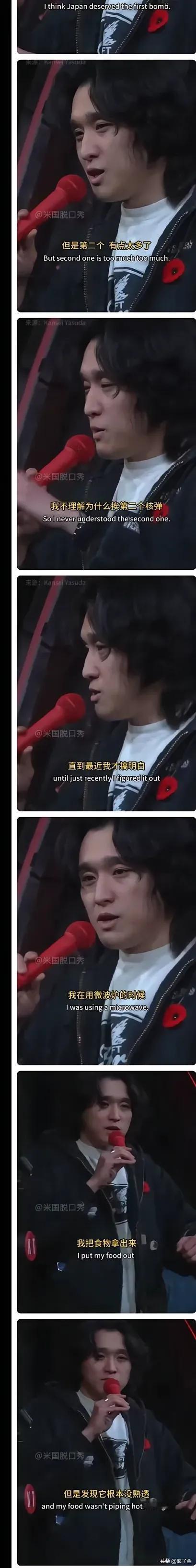 日本脱口秀演员敢说又敢唠,直面历史有点意思 刷到个日本脱口秀演员,脑回路是真清奇!一上来就找中国人,直言道歉,还聊到核炸弹——说第一个日本该挨,第二个就多了,竟拿微波炉热不熟食物来搞笑。 这幽默劲儿挺特别,关键是敢直面历史,不扭捏遮掩。能把敏感话题说得这么有意思,确实有点本事,让人印象深刻!