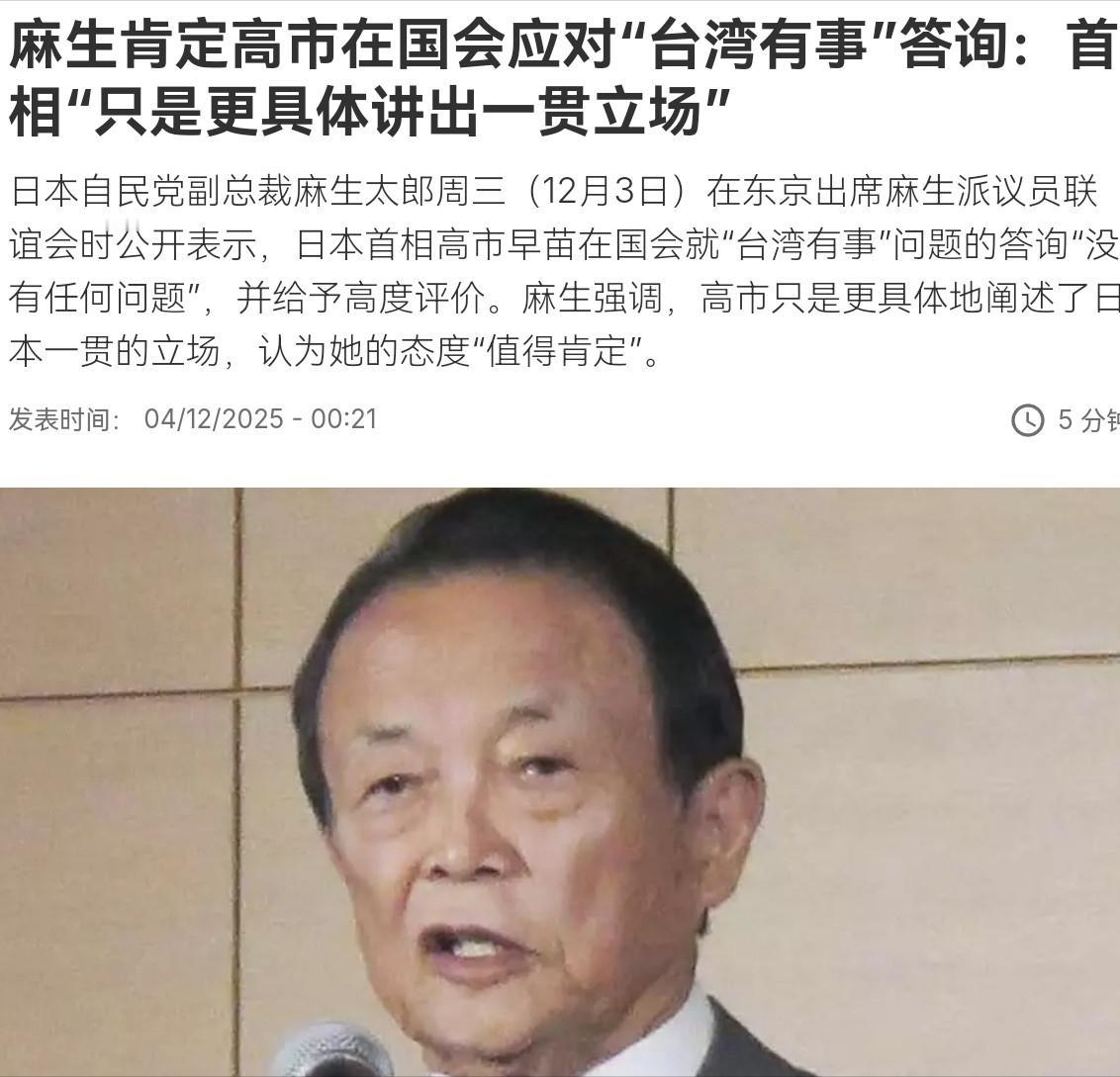 麻生太郎从幕后走向了前台!高市早苗刚态度放软表示,日本政府立场与1972年的《日中联合声明》一致,没有任何改变之后,麻生太郎出来讲话了。12月3日,麻生太郎表示,日本首相高市早苗在国会就“台湾有事”问题的答询“没有任何问题”,并给予高度评价。麻生强调,高市只是更具体地阐述了日本一贯的立场,认为她的态度“值得肯定”。 麻生指出:中国虽然批评不少,但被他们讲几句也没什么。高市只是更具体地讲出日本过去一贯的立场,用‘我只是说实话,有什么不对?’的态度去回应,这样的表现让我感到很欣慰。很显然,在这这个时间点,麻生太郎出来表态,非常的不同寻常。 麻生太郎的意思是什么呢?那就是他不认为高市早苗的挑衅有任何的问题,日本不能因为中国不高兴,而不把自己的态度亮出来。 高市早苗的“放软”姿态,在当时看来,颇有些出乎意料。毕竟,她作为安倍晋三的政治继承者之一,一贯以强硬的保守派形象示人。 她在国会中的这番表态,一度被外界解读为日本政府在面对复杂国际形势时,选择的一种更为审慎和务实的沟通方式,试图为紧张的关系寻找一个喘息的契机。 这种表态,仿佛是在说,我们依然承认那个重要的历史文件,基础没有动摇。这番话术,无疑为外界提供了一种积极的想象空间,让人们猜测日本是否正在调整其战略姿态。 然而,政治的微妙之处就在于,话往往不能只听一半。就在大家还在品味高市早苗这番话的深意时,麻生太郎,这位在日本自民党内拥有巨大影响力的元老级人物,以一种不容置疑的口吻,为整个事件定下了新的调子。 他公开表示,高市早苗此前在国会就“台湾有事”问题的答询“没有任何问题”,甚至给予了高度评价。这番话,瞬间让之前的“缓和论”变得苍白无力。 麻生太郎的逻辑很直接,他认为高市并没有改变什么,只是把日本过去一贯的立场,用更具体、更坦白的方式说了出来。 麻生太郎的这番话,其真正的潜台词远比字面意思来得深刻。他传递出的信息是,日本不应该因为中国的批评或不满,就隐藏或改变自己的真实想法。他甚至用一种近乎轻描淡写的语气表示,“被他们讲几句也没什么”,这种姿态,本身就是一种强硬。 他推崇的是一种“我只是说实话,有什么不对?”的沟通哲学,并将高市早苗的表现形容为“值得肯定”和“感到欣慰”。这不仅仅是简单的支持,更像是一种政治上的“授权”,鼓励内阁成员更大胆地表达那些过去可能被认为过于敏感的观点。 这背后,其实反映了日本政坛内部一股持续涌动的思潮。随着地区安全环境的变化,特别是中国军力的快速发展和在台海活动的日益频繁,日本国内关于“台湾安全即日本安全”的论调早已不再新鲜。 从增加国防预算,到讨论拥有“反击能力”,再到不断强化美日同盟的军事一体化,日本的战略转型一直在稳步推进。高市早苗在国会的答询,以及麻生太郎随后的力挺,正是这股大趋势下的一个具体缩影。它们看似是个人言论,实则是日本整体战略姿态日趋主动和强硬的一种外在表现。 麻生太郎选择在这个时间点站出来,其时机也颇为讲究。他不仅仅是在为高市早苗个人背书,更是在为日本未来的对华政策方向进行一次公开的“压力测试”。 他似乎在试探,当日本不再满足于模糊的战略模糊,而是选择更加直白地亮出底牌时,各方将如何反应。这种从幕后走向前台的姿态,标志着日本内部可能正在达成一种新的共识:与其小心翼翼地维持一种脆弱的平衡,不如主动出击,掌握话语权。 这种转变,无疑会给未来的中日关系以及整个东亚的格局,带来更多的不确定性。这究竟是日本走向“正常国家”的必经之路,还是一场高风险的战略赌博,或许只有时间能给出答案。对此,你又怎么看呢?