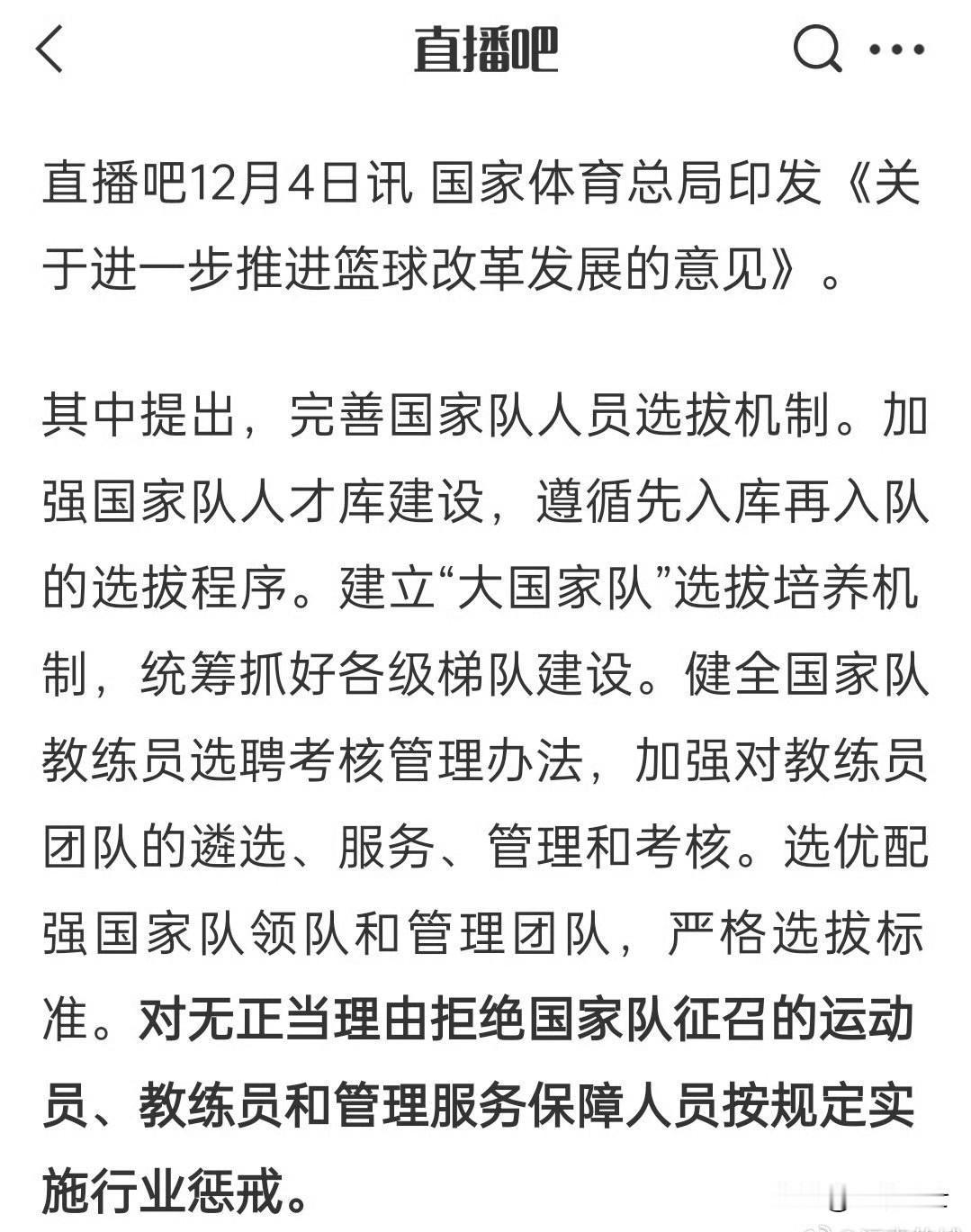 赵继伟要注意了[捂脸]国家队新规 《关于进一步推进篮球改革发展的意见》,对于无正当理由拒绝国家队征召的运动员、教练员和管理服务保障人员按规定实施行业惩戒。 这规定一出,以后没有“人在做,天在看”了,也没有抑郁症离队,或者中耳炎离队。