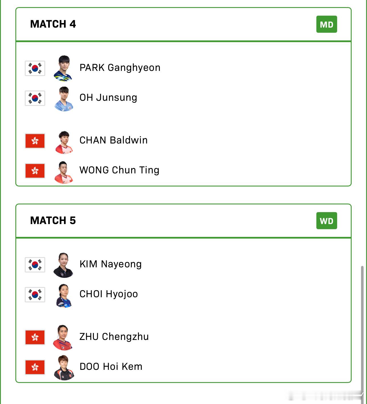 2025混合团体世界杯循环赛韩国VS中国香港朴康贤/金娜英VS黄镇廷/杜凯琹李恩惠VS朱成竹张禹珍VS陈颢桦朴康贤/吴晙诚VS黄镇廷/陈颢桦金娜英/崔孝珠VS杜凯琹/朱成竹