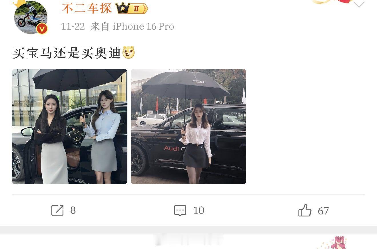 连续刷到两条奥迪和宝马合体营销相关的微博(也许是大数据),跟同感,这很抽象。我记得奥迪以前的营销方案要经过VGA审核的,其中一点就是品牌调性啊。汽车汽车营销