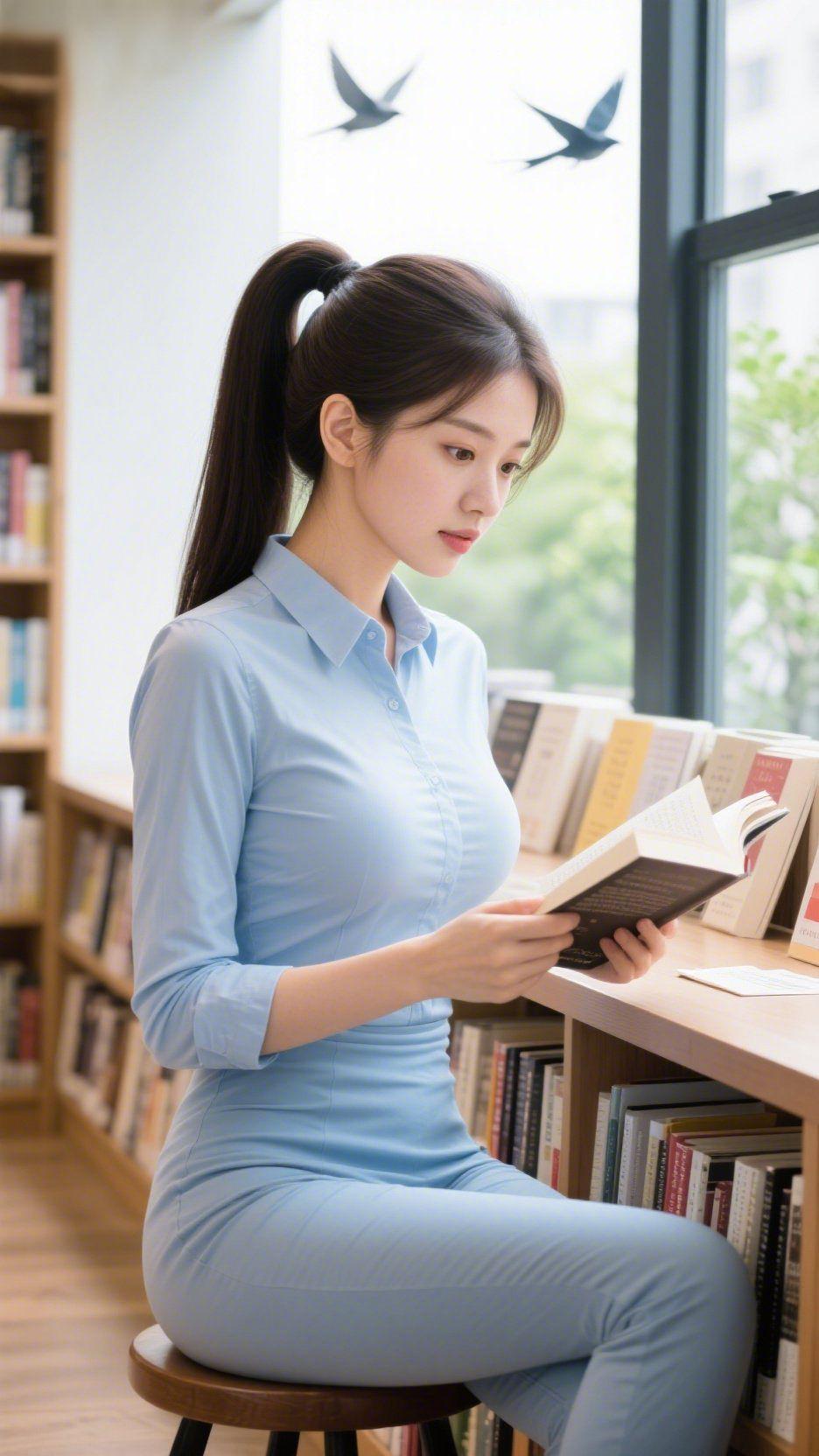 窗畔闲读 春阳漫过窗棂,把图书馆的木架浸得温软。她坐在矮凳上,天蓝色衣装衬得眉目清和,指尖轻触书页时,马尾随翻书的动作轻扬,恰与窗外掠过的燕影撞了个软和的照面。 书架间浮着纸页的淡香,是散文里的新柳,是诗集里的流泉,裹着她垂眸的专注,落在一行行字句里。风从窗缝钻进来,掀动书页的边角,连空气里的浮尘,都跟着慢了节奏。 原来最妥帖的时光,是这样不慌不忙的——读几页书,听风过窗,连燕鸣都成了恰好的背景音,把普通的午后,织成了心上的静。 春日书闲 馆中清宁