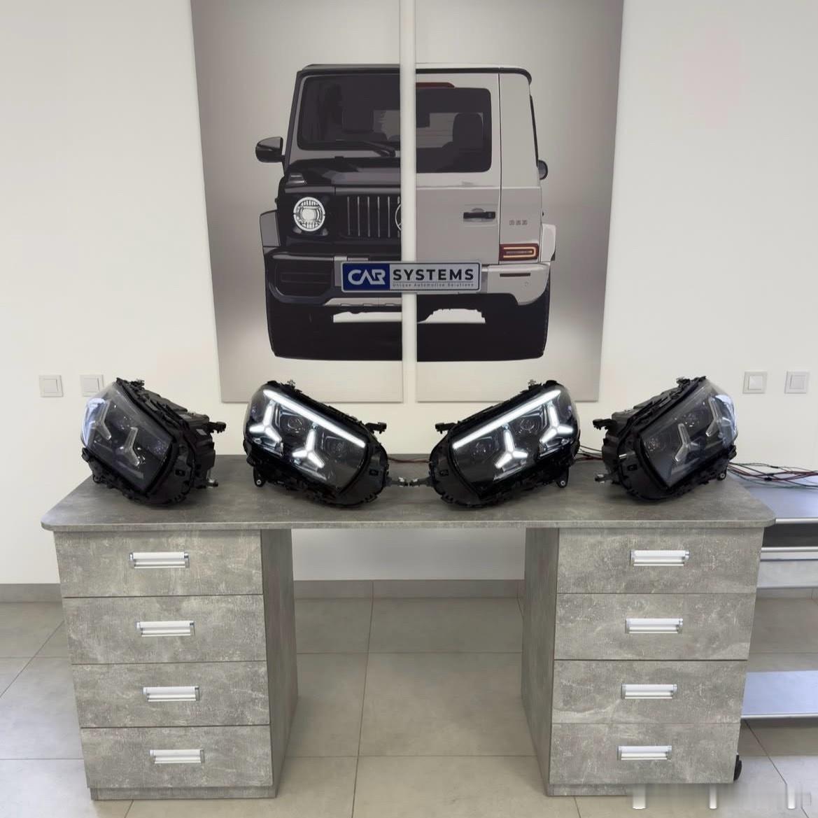 奔驰W223 S级中改前灯部件高清图曝光点亮和不点亮的都有。非常清晰了,两个奔驰标,顶上一字眉