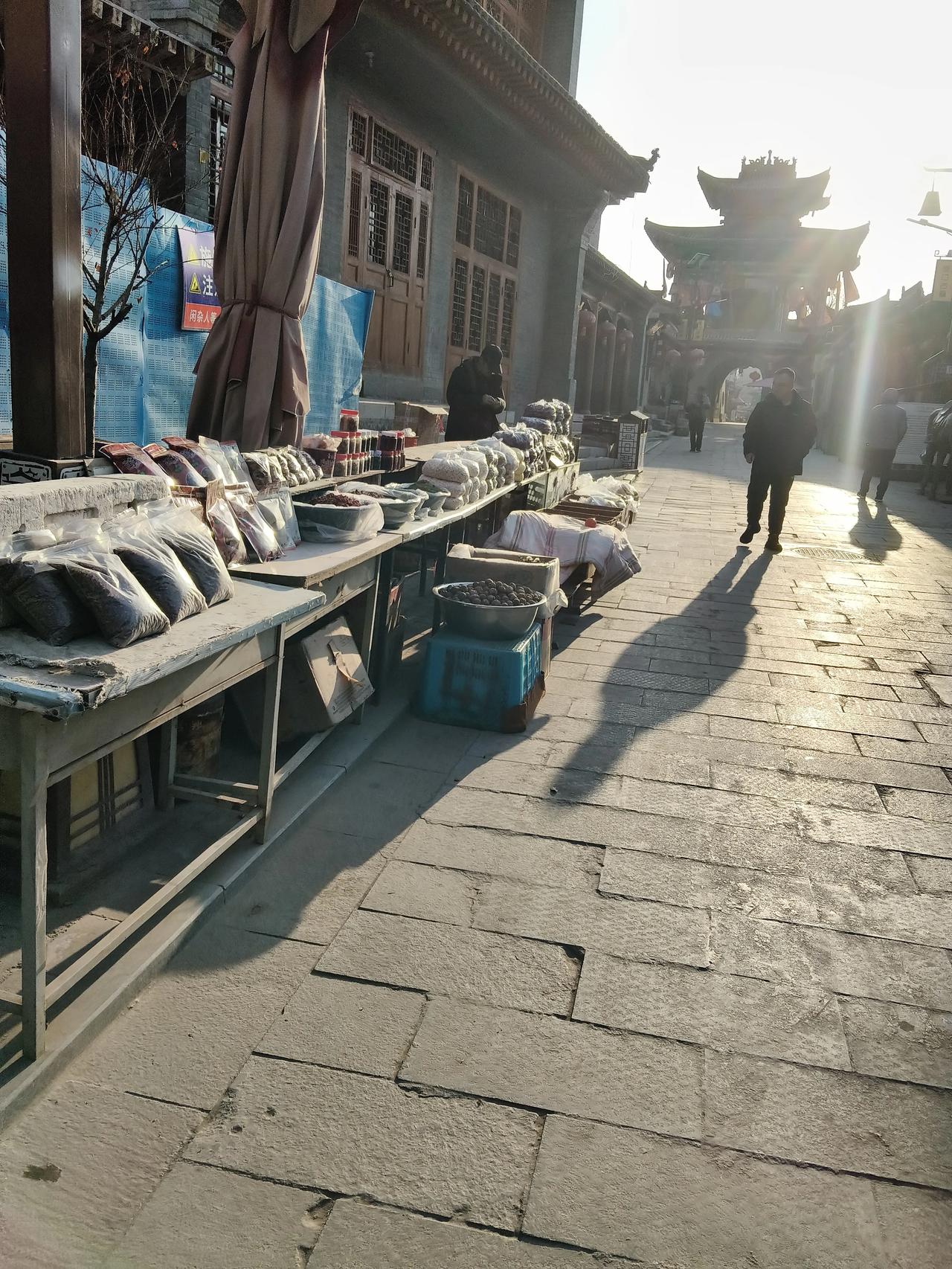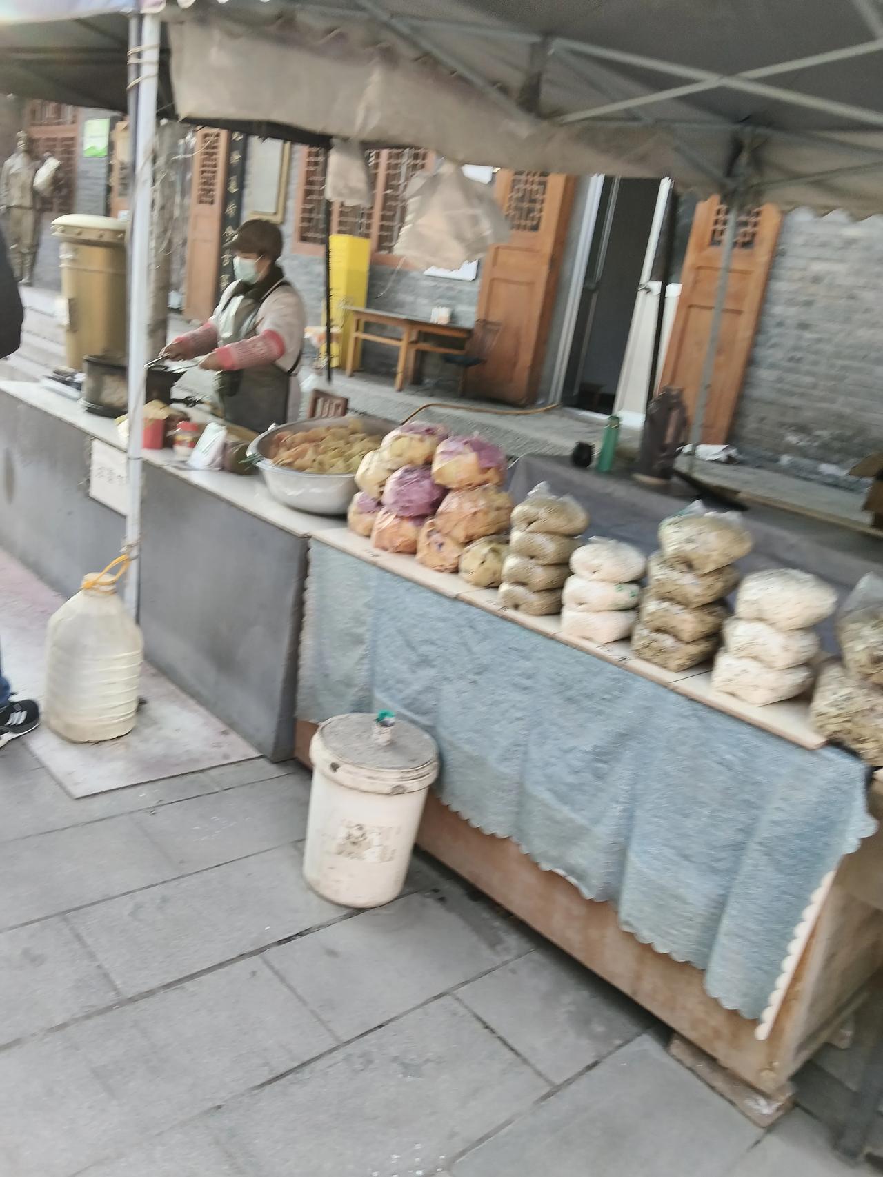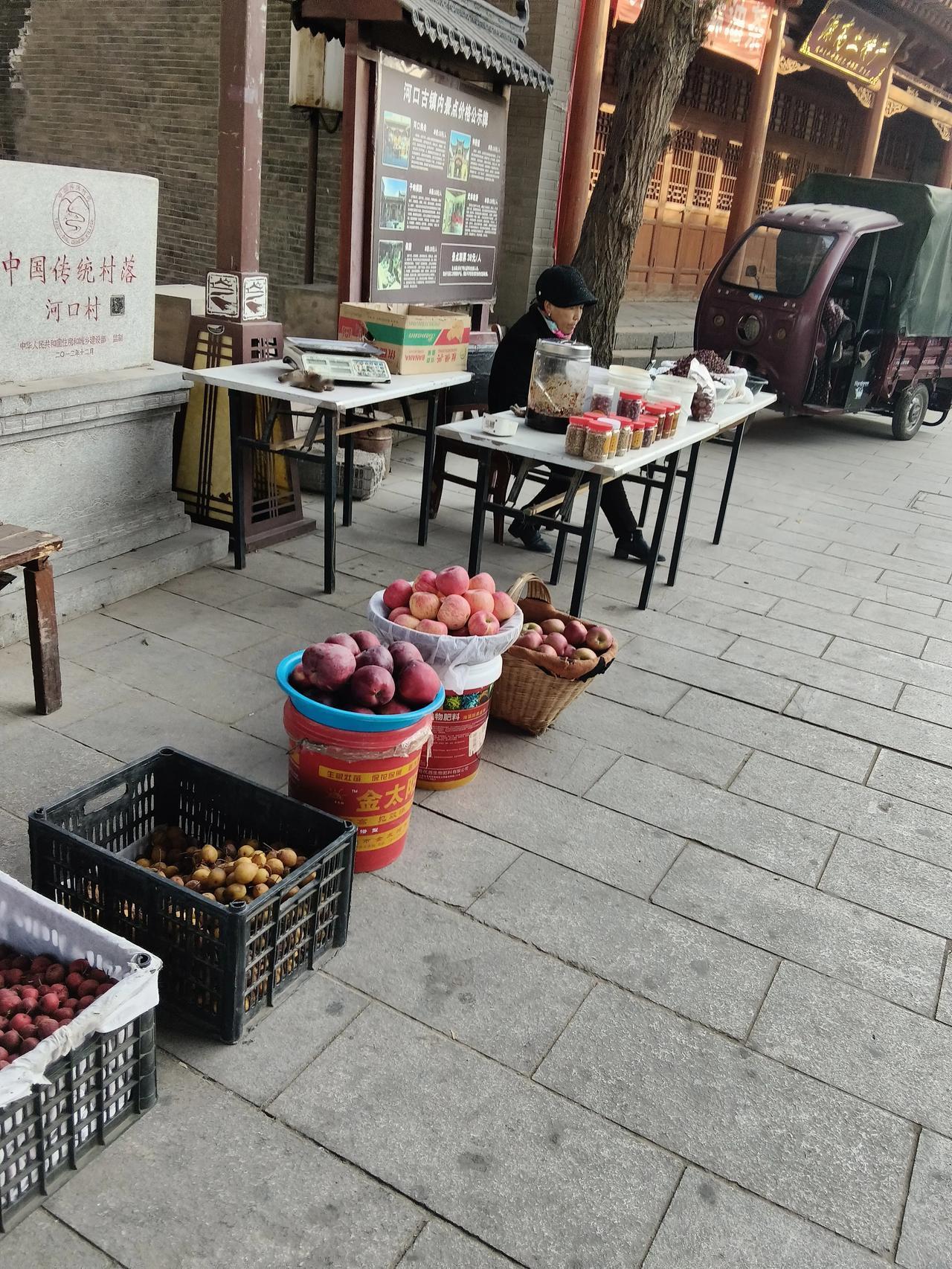 兰州河口古镇的特色美食油壶暄,今天因为没有什么游客,老板只能自己在那坐做着等游客。 河口古镇上还有村民卖自己产品,比如种的白菜萝卜,大枣,苹果,核桃都很便宜。