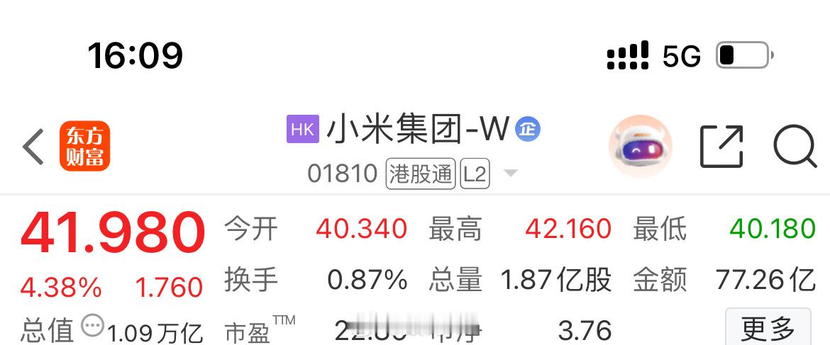 小米今天涨了4.38%,来到了41.98,最高涨到42.16,不知道今天还回购不