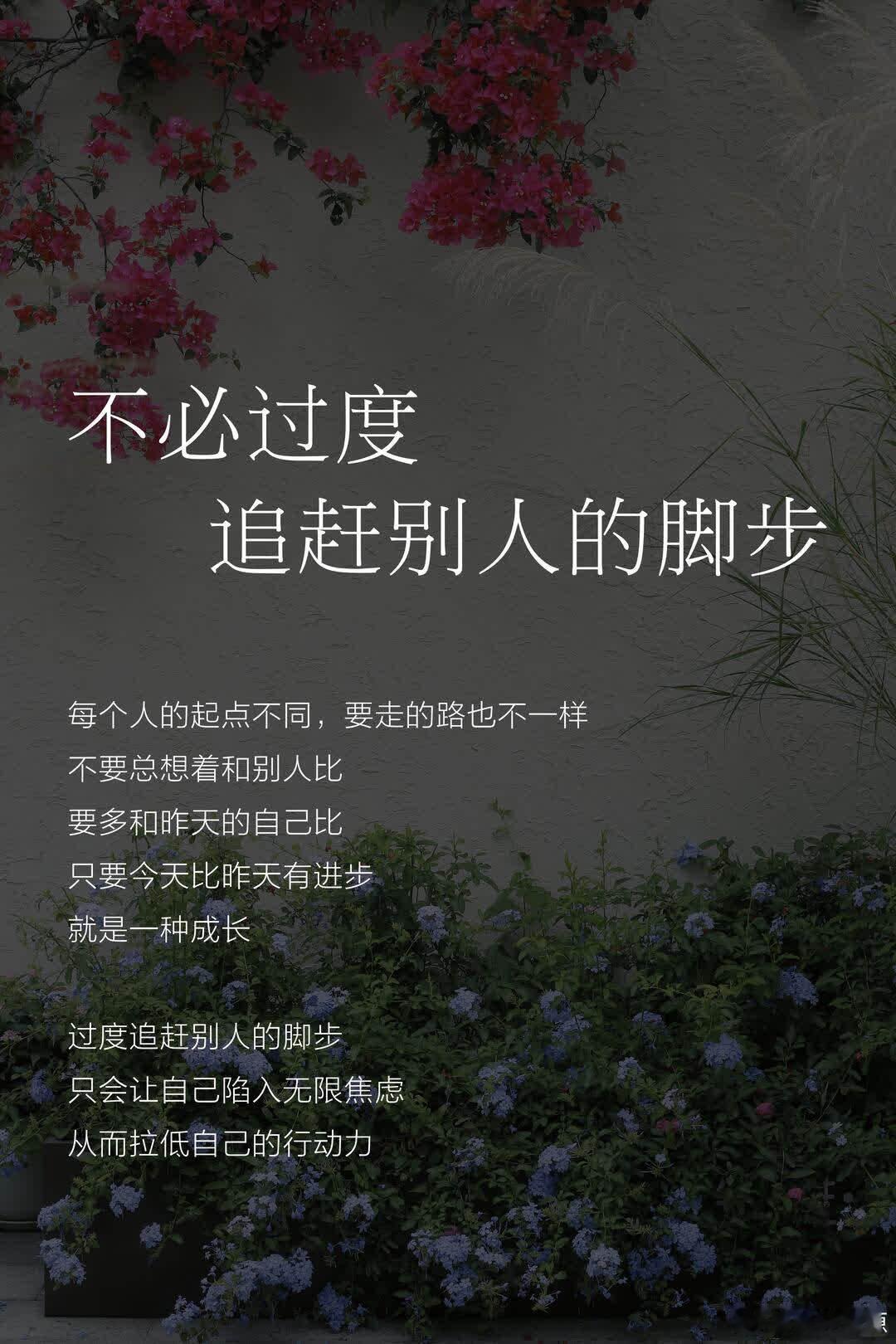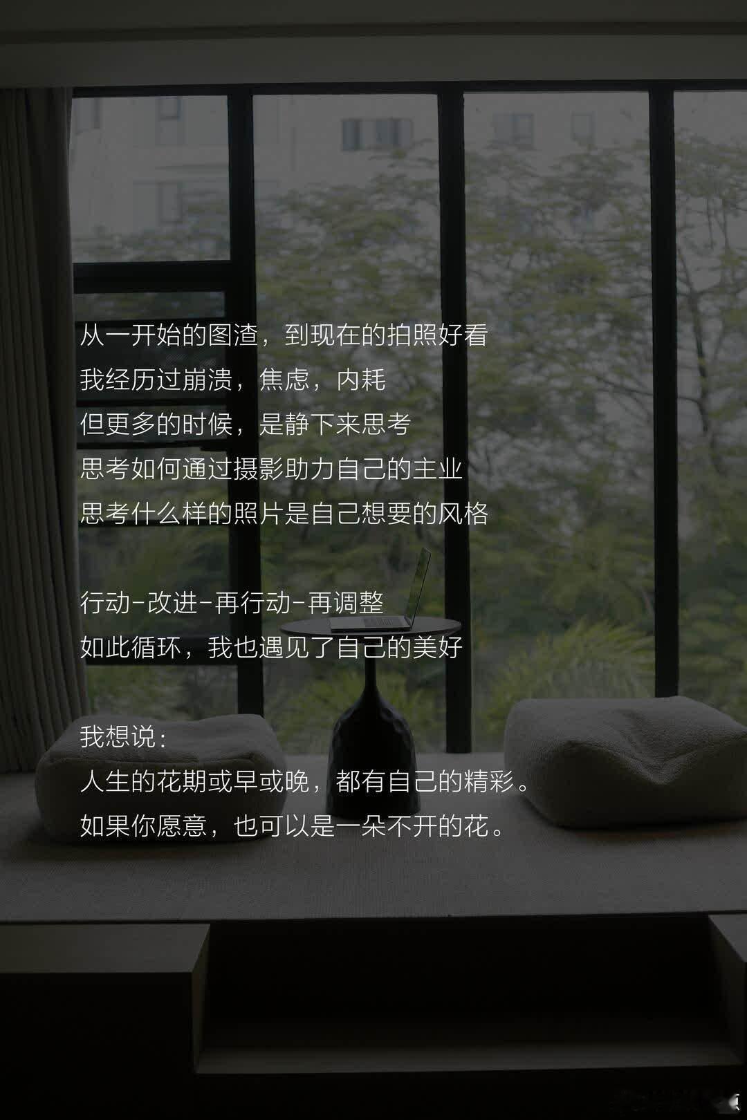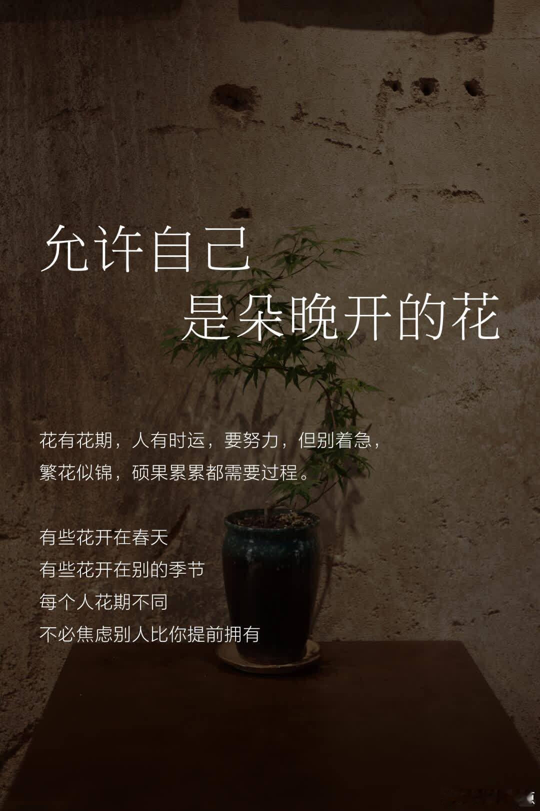 “允许自己,是朵晚开的花” 花有花期,人有时运,要努力,但别着急, 繁花似锦,硕果累累都需要过程。 · 有些花开在春天 有些花开在别的季节 每个人花期不同 不必焦虑别人比你提前拥有 · ❶不必过度追赶别人的脚步 · 每个人的起点不同,要走的路也不一样 不要总想着和别人比 要多和昨天的自己比 只要今天比昨天有进步 就是一种成长 · 过度追赶别人的脚步 只会让自己陷入无限焦虑 从而拉低自己的行动力 · ❷每一个阶段都是为未来蓄力 · 别着急,允许自己慢慢来 春耕夏种秋收冬藏,所有的收获,都要经过时间的沉淀。 · 我们要做的就是给这颗种子施肥,浇水,除草,然后耐心等它长大。 · 养自己的过程,和养孩子的过程是一样的。 给予自己无限的爱,耐心和用心,一定会收获一个不一样的自己。 · ❸相信自己一定可以和美好相逢 · 曾经,我也无.比羡慕拍照好看的人 我幻想着,如果我也是这样的人该多好呢? · 现在,我的幻想成真了。 我也成了别人羡慕的对象。 · 从一开始的图渣,到现在的拍照好看 我经历过崩溃,焦虑,内耗 但更多的时候,是静下来思考 思考如何通过摄影助力自己的主业 思考什么样的照片是自己想要的风格 · 行动-改进-再行动-再调整 如此循环,我也遇见了自己的美好 · 我想说: 人生的花期或早或晚,都有自己的精彩。 如果你愿意,也可以是一朵不开的花。 · ❹做一个长期主义者 · 去选择你喜欢的事情,然后坚持 这件事情,可以是阅读,也可以阅读 可以是拍照,也可以是作图 总之,要选择自己喜欢的 · 热爱,是平淡人生的调味剂 沉浸在自己热爱的时光里 你的内心会生出无限的力量 · 这些力量,会让你坚持去做这件事 就如我热爱摄影 每一张照片都是对生活蕞好的记录 · 那些看似不起波澜的日复一日 终会在某一天,让你看到坚持的意义 · 每个人都有自己的花期 请允许自己是那朵晚开的花