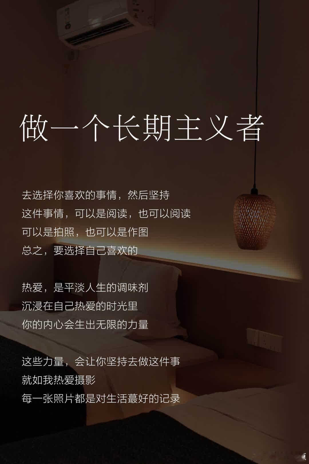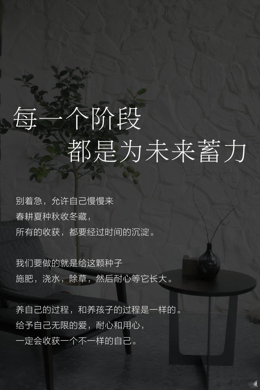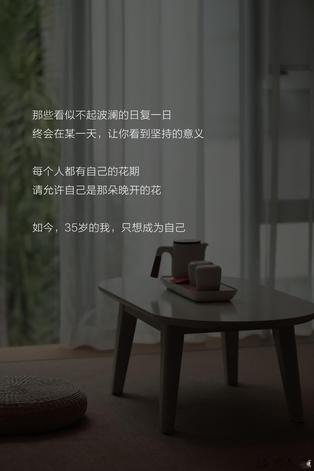 “允许自己,是朵晚开的花” 花有花期,人有时运,要努力,但别着急, 繁花似锦,硕果累累都需要过程。 · 有些花开在春天 有些花开在别的季节 每个人花期不同 不必焦虑别人比你提前拥有 · ❶不必过度追赶别人的脚步 · 每个人的起点不同,要走的路也不一样 不要总想着和别人比 要多和昨天的自己比 只要今天比昨天有进步 就是一种成长 · 过度追赶别人的脚步 只会让自己陷入无限焦虑 从而拉低自己的行动力 · ❷每一个阶段都是为未来蓄力 · 别着急,允许自己慢慢来 春耕夏种秋收冬藏,所有的收获,都要经过时间的沉淀。 · 我们要做的就是给这颗种子施肥,浇水,除草,然后耐心等它长大。 · 养自己的过程,和养孩子的过程是一样的。 给予自己无限的爱,耐心和用心,一定会收获一个不一样的自己。 · ❸相信自己一定可以和美好相逢 · 曾经,我也无.比羡慕拍照好看的人 我幻想着,如果我也是这样的人该多好呢? · 现在,我的幻想成真了。 我也成了别人羡慕的对象。 · 从一开始的图渣,到现在的拍照好看 我经历过崩溃,焦虑,内耗 但更多的时候,是静下来思考 思考如何通过摄影助力自己的主业 思考什么样的照片是自己想要的风格 · 行动-改进-再行动-再调整 如此循环,我也遇见了自己的美好 · 我想说: 人生的花期或早或晚,都有自己的精彩。 如果你愿意,也可以是一朵不开的花。 · ❹做一个长期主义者 · 去选择你喜欢的事情,然后坚持 这件事情,可以是阅读,也可以阅读 可以是拍照,也可以是作图 总之,要选择自己喜欢的 · 热爱,是平淡人生的调味剂 沉浸在自己热爱的时光里 你的内心会生出无限的力量 · 这些力量,会让你坚持去做这件事 就如我热爱摄影 每一张照片都是对生活蕞好的记录 · 那些看似不起波澜的日复一日 终会在某一天,让你看到坚持的意义 · 每个人都有自己的花期 请允许自己是那朵晚开的花