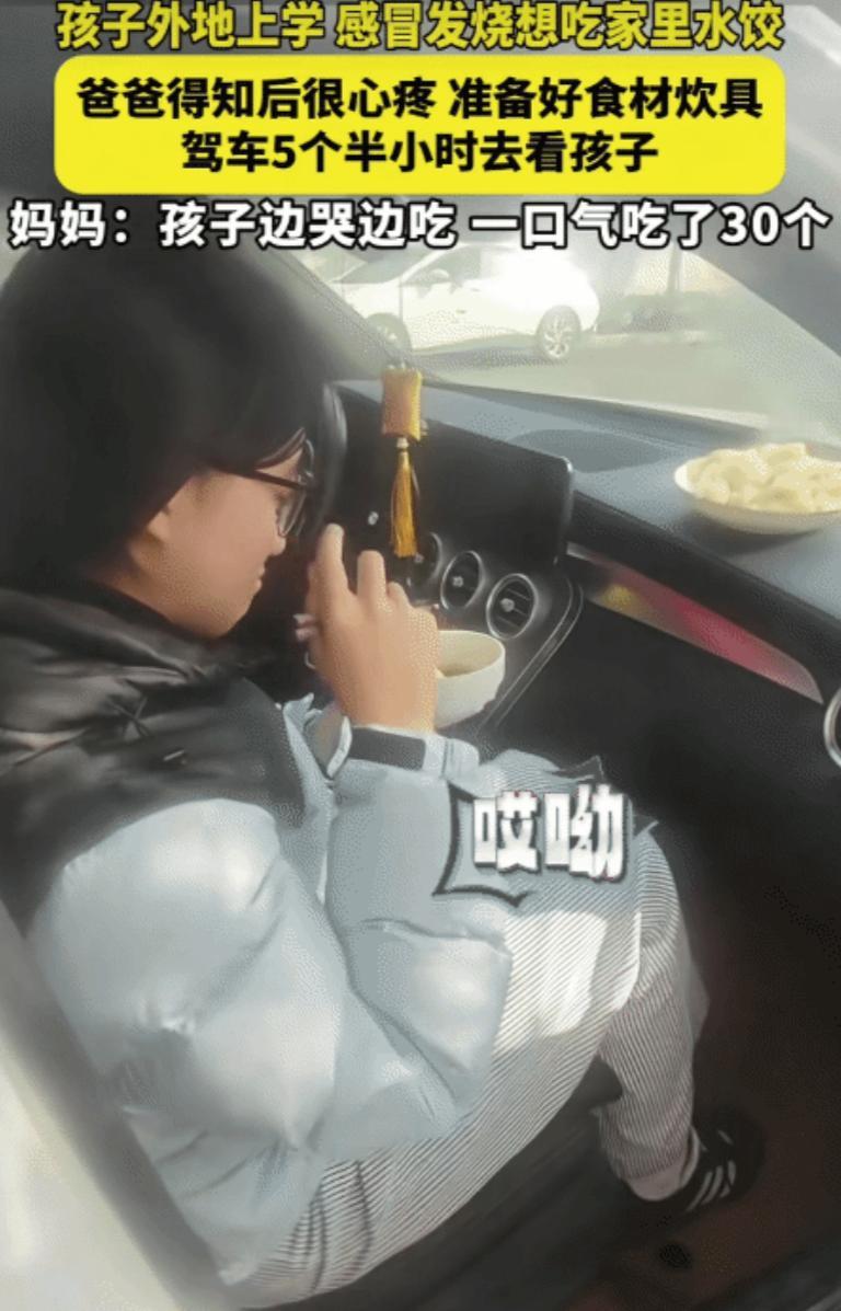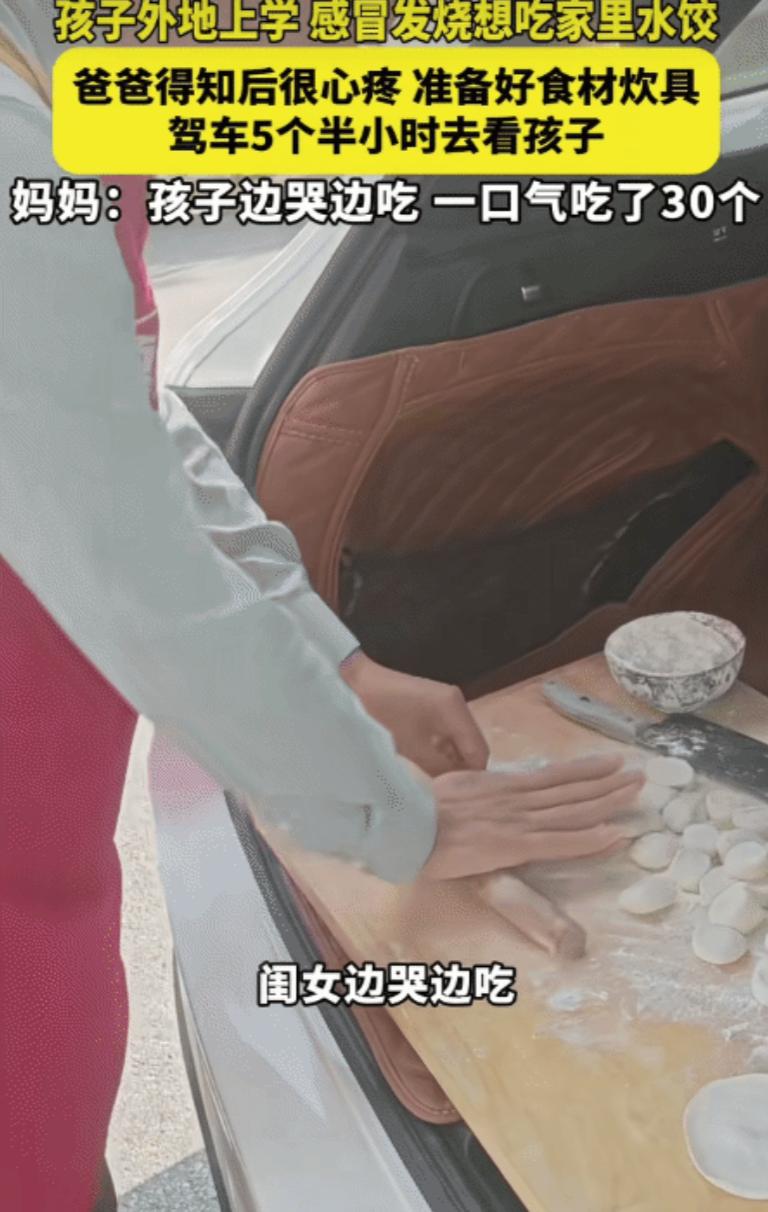 吃着吃着就哭了!山东潍坊,一女孩到外地上大学,这两天感冒难受,给家里打电话时就说了句“想吃家里的饺子”,没想到,父亲直接开车五个多小时把饺子送到女儿手上,女儿坐在车里,吃着吃着就哭了起来 女孩今年考上了南京大学,这两天正赶上感冒发烧,人一不舒服,胃口也跟着变小,嘴里唯一想的就是家里的那点熟悉味道。跟父母打电话时,说想吃家里的白菜熟肉水饺 本来女孩就是随口一说,可说者无心听者有意,爸爸挂掉电话后,自己在家默默把材料备齐,天还没亮就从山东出发,连夜往南京赶 五个小时的路程,他一个人开着车,估计心里装的就一句话,孩子难受就得有人在旁边照应。到了学校门口 女孩事先并不知道父亲会来,在校门外见到自家车时,人都愣住了。更让她没想到的是,父亲没带煮好的饺子,而是直接把车后备箱当成了厨房,现场擀皮、调馅、包饺子,然后架起小锅,在校门口煮了起来 饺子出锅,女孩端着碗,一边吃一边掉眼泪。她说,就是这个味。一口气吃了三十个 其实母亲也来了,夫妻俩在南京待了两天,给女儿做了四顿饭,顿顿都是饺子。临走前,父亲抱了抱她,没多说什么,就开车回去了 看到这个事,不止视频里的女儿哭了,屏幕外的我们也被感动了,而且这里有一个细节,就是她爸不是在家包好拿来,而是把面和馅都装后备箱,到了学校再现场擀皮、现场包、现场煮 这动作听着挺笨,但就是这种笨劲儿让人觉得踏实。那不是技巧,那是心里装着孩子,想着她吃到嘴里一定是热乎的、现做的。父母的心思就是这样,不讲浪漫,讲实用 离家的孩子,就像风筝,线始终在父母手里攥着。那根线不是束缚,而是你知道,无论飘到哪里,都有人在地上稳稳牵着