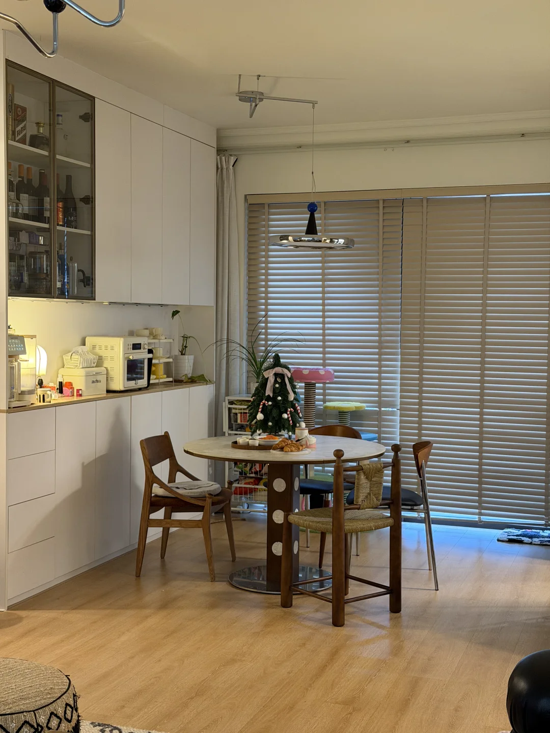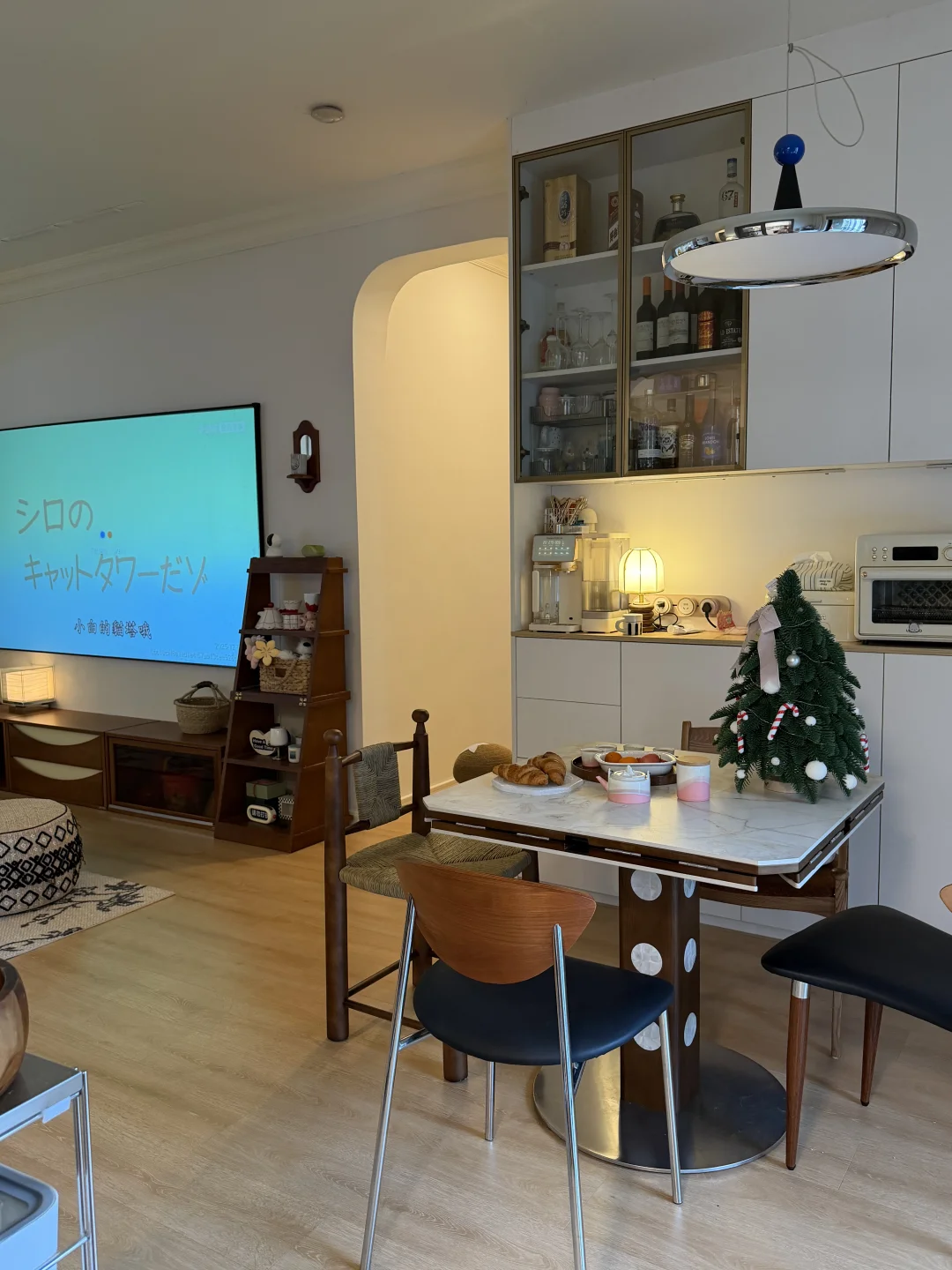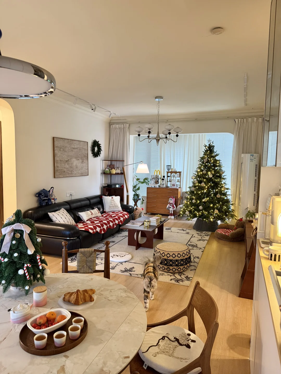 虽然虽然是别人挑剩的西户精装房 但是经过努力,一步步把精装房改造成现在温馨小家 按照自己喜欢的风格改造 整体硬装没改,封窗➕通铺木地板 全屋都是浅色系的漆 家具木质家具,黑白棕配色为主 整体不会单调廉价~ 餐厅比较宽,我选择打了整墙的餐边柜 搭配中古风岩板圆桌,收纳跟颜值都有了! 邻近圣诞了,给家里添置一颗很美丽的圣诞树 布置好,整个家里都很温馨,也不用出门过圣诞节啦! 在家就可以过!!! 和小猫住在这里,感觉人生都变好了