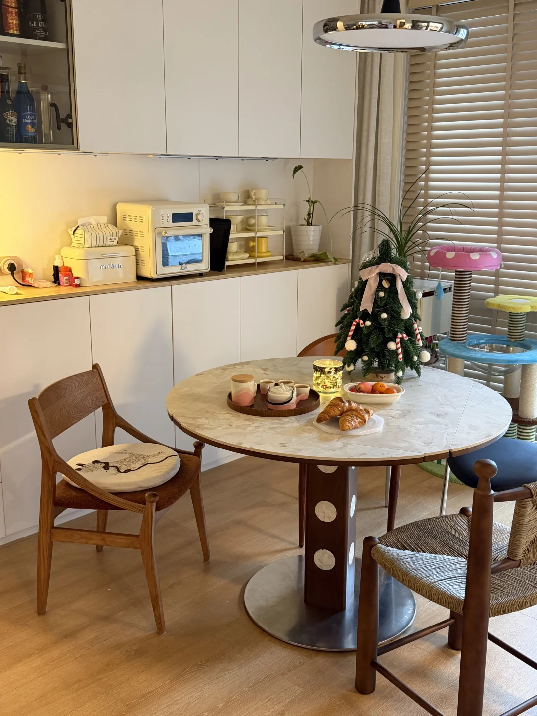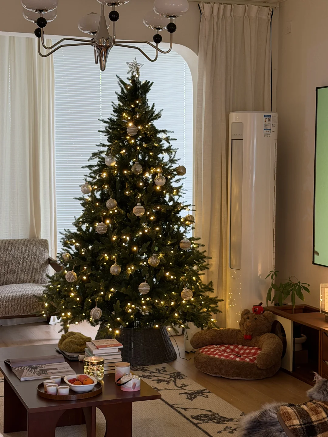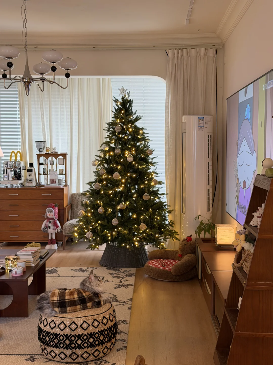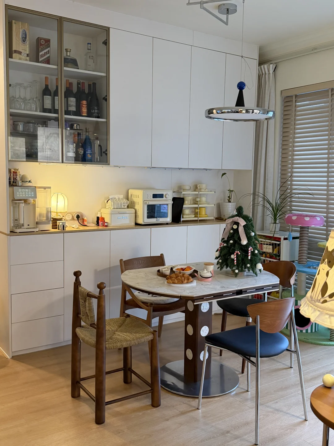 虽然虽然是别人挑剩的西户精装房 但是经过努力,一步步把精装房改造成现在温馨小家 按照自己喜欢的风格改造 整体硬装没改,封窗➕通铺木地板 全屋都是浅色系的漆 家具木质家具,黑白棕配色为主 整体不会单调廉价~ 餐厅比较宽,我选择打了整墙的餐边柜 搭配中古风岩板圆桌,收纳跟颜值都有了! 邻近圣诞了,给家里添置一颗很美丽的圣诞树 布置好,整个家里都很温馨,也不用出门过圣诞节啦! 在家就可以过!!! 和小猫住在这里,感觉人生都变好了