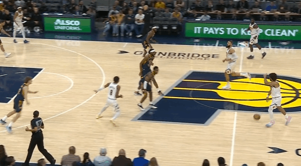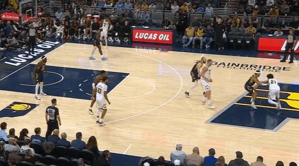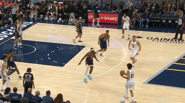 逐帧拆解:穆雷赛季最佳单场表现,对阵步行者狂砍52分图1约基奇持球过半场后立即高位拿球与上线的穆雷、哈达威发动三人小组战术,也天然将对方中锋调度在上线。这个回合掘金应该是要打“Middle Zoom“战术。内姆见穆雷要借助哈达威的无球掩护上提与约基奇衔接手递手配合,立即采取”Top-Lock“(倒扣防守)站位,于是穆雷见招拆招:佯装上提进一步骗取内姆防守身位,随后迅速反跑空手切入篮下,接约基奇传球上篮得手。图2持球推过半场后抓早期进攻阶段、步行者阵地防守立足未稳立即借助沃特森设置的“Drag Screen”,变向走掩护墙一侧后左手持球右脚踩进三分线内刺探,随后迅速衔接炸球撤步三分。图3这个回合也是同样的技术:这是非常多球员喜欢用的一招,我最近写过的球员里就有CC、里夫斯、亚历山大、爱德华兹:图4、5、6、7。图8穆雷高位和约基奇发动挡拆配合,这个回合约基奇选择“Slip”假挡快拆给的掩护质量并不扎实,但沃克还是在处理掩护的过程中被穆雷摆脱在身后,穆雷挡拆行进间利用沃克从身后追防向前的惯性再加上急停换到左手后迅速衔接“刺探急停”直接晃飞了沃克,然后衔接炸球撤步中投。图9第一波传切进攻开发不力后回给上线的穆雷,穆雷随即和约基奇衔接边路挡拆,发动第二波进攻,继续“戏耍”沃克:依旧是借助挡拆将沃克摆脱在身后,之后利用其向前追防的惯性和“刺探急停”晃出投篮空间,佯装回给外拆的约基奇诱导布拉德利归位的同时降低沃克的警惕,随后迅速拔起中投。图10为约基奇设置非常扎实的“反向挡拆”迫使内姆上前强延误,因此外拆获得投篮空间,虚晃点飞归位扑防的内姆,炸球横撤步调整后三分稳稳命中。图11弱侧底角空位张手要球,接球后左路突破惩罚西卡的过度扑防,面对执行“剥离换防”(Peel Switch)的内姆背转身强对抗撞飞,再迅速衔接前转身翻身金鸡独立。图12底角上提执行“Chicago Action”将内姆摆脱在身后,佯装使用“刺探急停”后的撤步中投,吸引其上扑干扰后再迅速衔接向前的二次加速,完全晃飞内姆防守重心后迎着前来协防的西卡抛投命中,打进2+1。穆雷爆砍52分掘金战胜步行者