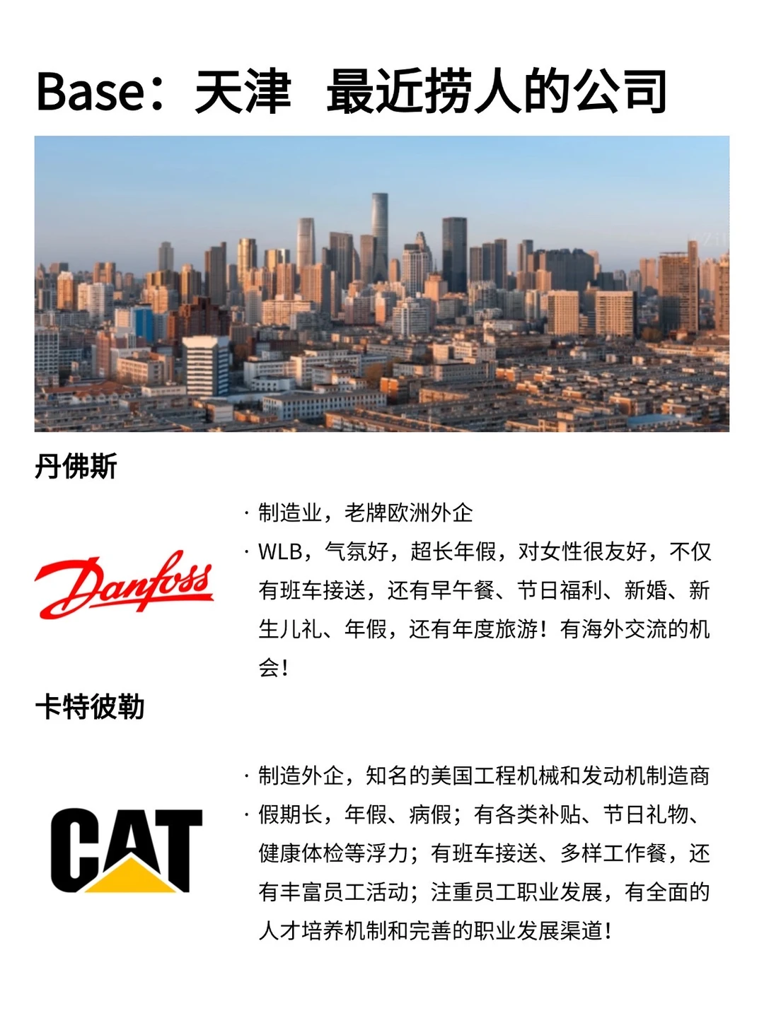 天津一直都是外企密度非常高的城市,有不少小而美、冷门宝藏的外企,机会是真的很多的!今天给大家整理了一些最近在捞人的外企 · 为什么还是值得去外企? ▪️氛围好,对女性友好,年假长,基本上都是10天起步 ▪️很多还都支持居家办公、福利完善,是真的能实现WLB ▪️不咋加班,待遇也还不错,想在天津找工作的真的可以考虑考虑~ · 坚持日更✊🏻,帮大家在找工作路上顺利拿 offer!