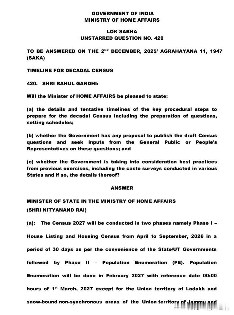 《德干先驱报》12月2日报道,印内政部国务部长尼蒂亚南德(Nityanand Rai)表示,印2027年的人口普查将分两阶段进行,政府正确定最终调查问卷。尼蒂亚南德以书面形式答复拉胡尔·甘地(Rahul Gandhi)等多名议员的相关问询(注:拉胡尔及其所在国大党问询此次人口普查是否会借鉴以往优秀实践,要求将国大党执政的特伦甘纳邦种姓调查实践作为新一轮人口普查的参照基准),表示根据内阁政治事务委员会4月30日作出的决定,2027年人口普查期间将同步开展种姓普查。他指出,普查问卷将在综合各部委、部门、组织以及普查数据使用者等各方意见的基础上最终确定。在问卷最终确定前,将实地测试普查问卷草案以评估其可行性。据悉,印2027年人口普查将分两个阶段实施。第一阶段为房屋登记与住房普查,为期30天,实施时间窗口为2026年4月1日至9月30日,具体起止时间由各邦/中央直辖区政府决定;第二阶段为人口普查,将于2027年2月开展。